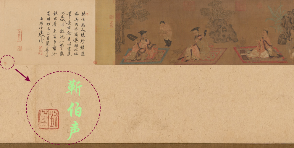 靳伯声,河北香河县人,生于1901年,1915年到天津一家南纸店学徒。1923年,他在天津经营南纸和新字画,兼卖古画。1933年,靳伯声在北京琉璃厂开论文斋古玩铺,以鉴定经营字画为主。靳与张大千等书画名家交好,于书画之道颇有心得。除《高逸图》外,还曾收入唐杜牧《张好好诗卷》、宋范仲淹《道服赞》、宋王诜《烟江叠嶂图》等名作。