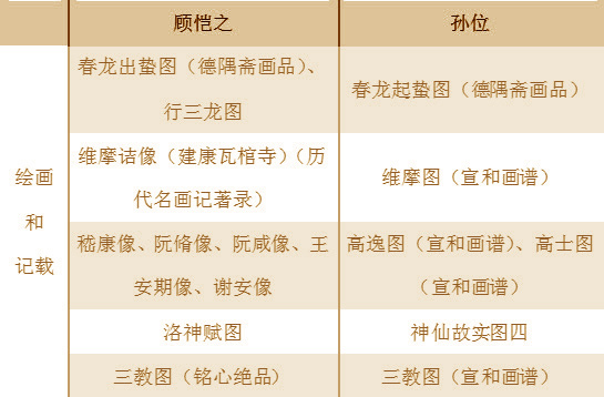 画家个人风格的形成有其自身实践积累的主观因素,也有时代大环境与历史传承的外围影响。承名世先生认为孙位的人物画受顾恺之的影响很大,因为他的许多画作如《维摩图》、《三教图》、《春龙出蛰图》等与百年之前顾恺之所创作的一些画作题名相似(图12)