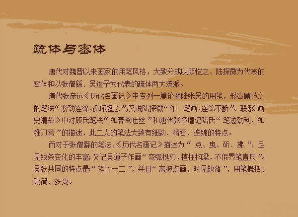 从顾恺之生活的时代到晚唐时期,曾先后涌现出许多出色的人物画家,如陆探微、张僧繇、吴道子等,其风格各有特点。张彦远在《历代名画记》中提出绘画有疏密二体的观点,他说“顾陆之神不可见其盼际,所谓笔迹周密也,张吴之妙,笔虽一二像已应焉,离披点画,时见缺落,此虽笔不周而意周也,方知有疏密二体,方可议乎画(文章15)