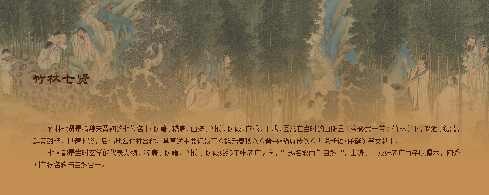 。画面以银杏、梧桐、乔柳、松柏等树木为间隔依次绘画席地而坐的人物8名,旁有榜题。南壁自外而内为嵇康、阮籍、山涛、王戎四人,北壁为向秀、刘伶、阮咸、荣启期 (延伸阅读18)