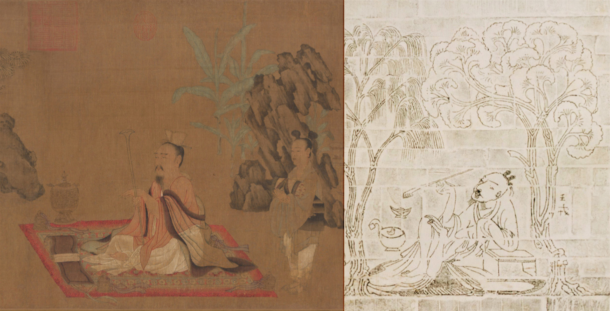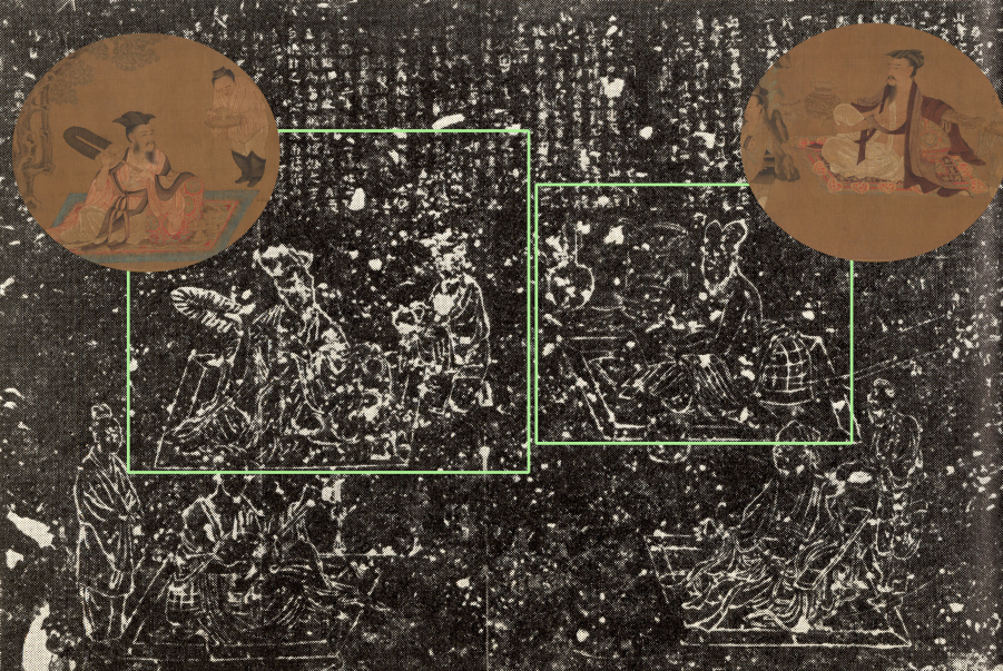而《高逸图》中的其他两位人物,虽然其形象与砖刻壁画中的人物难于准确对应,但有赖于清代发现的洛阳存古阁藏石刻《竹林七贤图》的图像 (图组22)