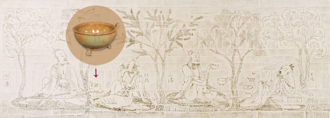 竹林七贤以好酒著称,因此酒器自然是画中必备的道具。砖刻画中山涛、阮籍、王戎身前都有一个带把的酒器,上面还浮着一只小鸭子。沈从文先生把这种酒器称为“凫头勺”,也有人根据1953年南京中华门外碧峰寺六朝墓中出土的同类带把陶瓢命名它为瓢樽 (图片27)