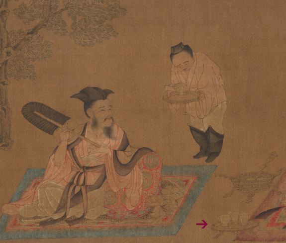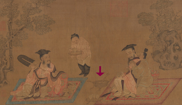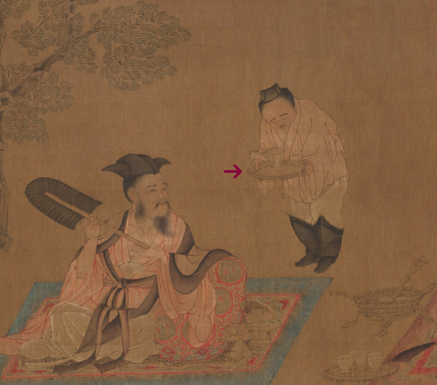 ,依靠花枕而坐,面前摆放着两盘仙桃蔬果,一位侍者双手恭敬地捧着放置酒杯的盏托,立于一旁,可以推断其人就是阮籍。