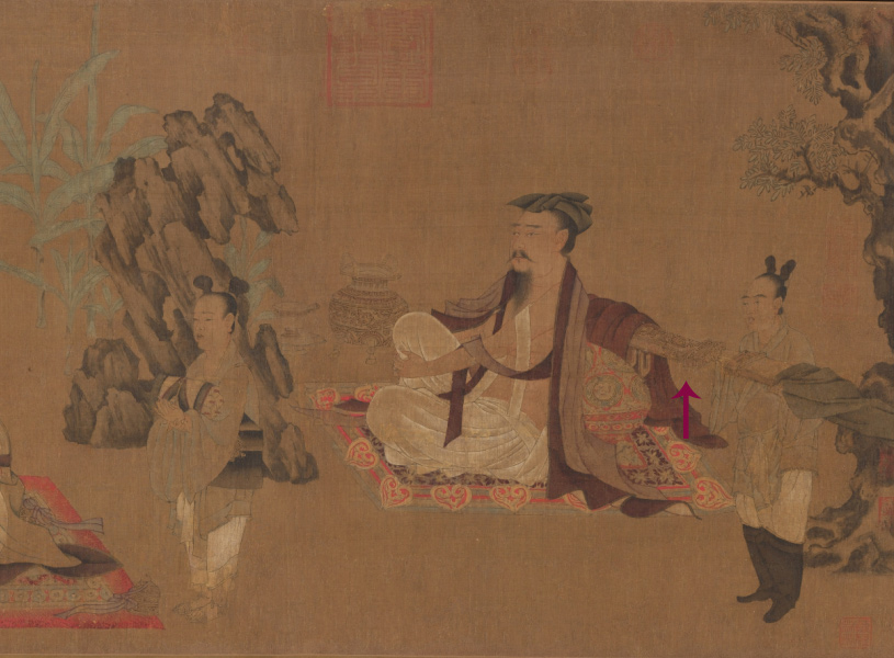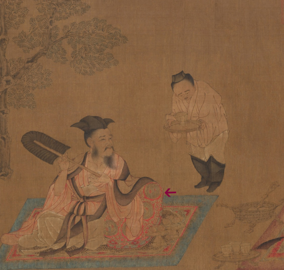 中也有一个侍女怀抱椭圆形的大隐囊。而《高逸图》中有三个人的身后靠着隐囊,其花纹是典型的“唐代大团科式华锦纹样”,体现出非常强烈的时代特征。