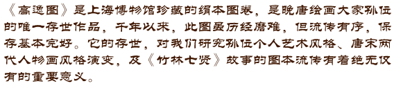 ,杨仁恺先生从其时代风貌与书法样式判断可能是隋唐官本。此画人物面目衣纹无纤媚之态,气味古朴,线描如春蚕吐丝,在用笔上与《高逸图》同属于游丝描体系。因此,通过孙位《高逸图》卷中人物神态、体貌衣纹的表现,我们也许可以想象顾恺之绘画作品中线条“紧劲连绵,循环超忽,调格逸易”的飘逸灵动和眉目之间“传神阿睹”的精妙之笔。