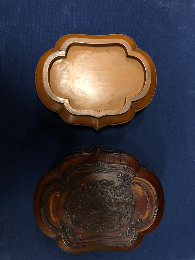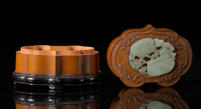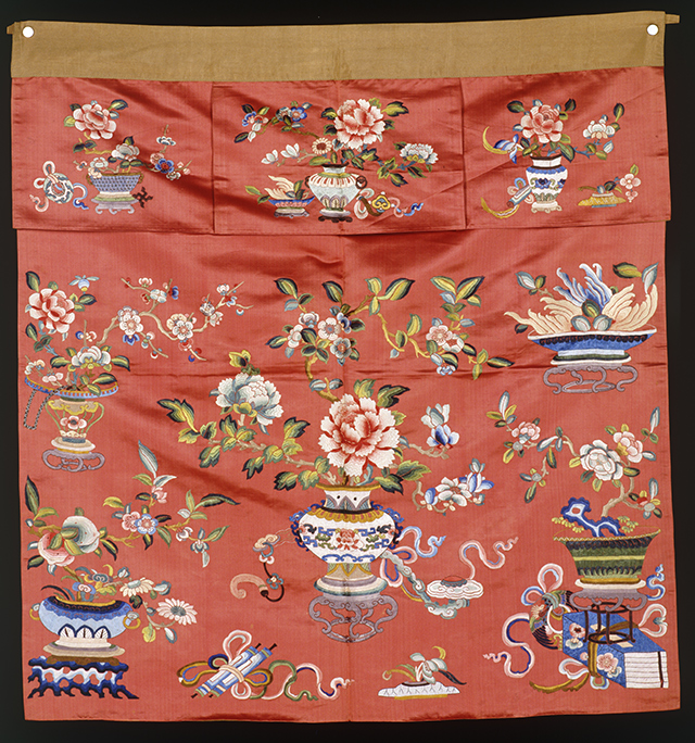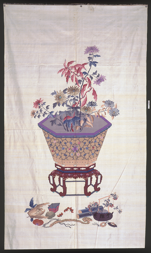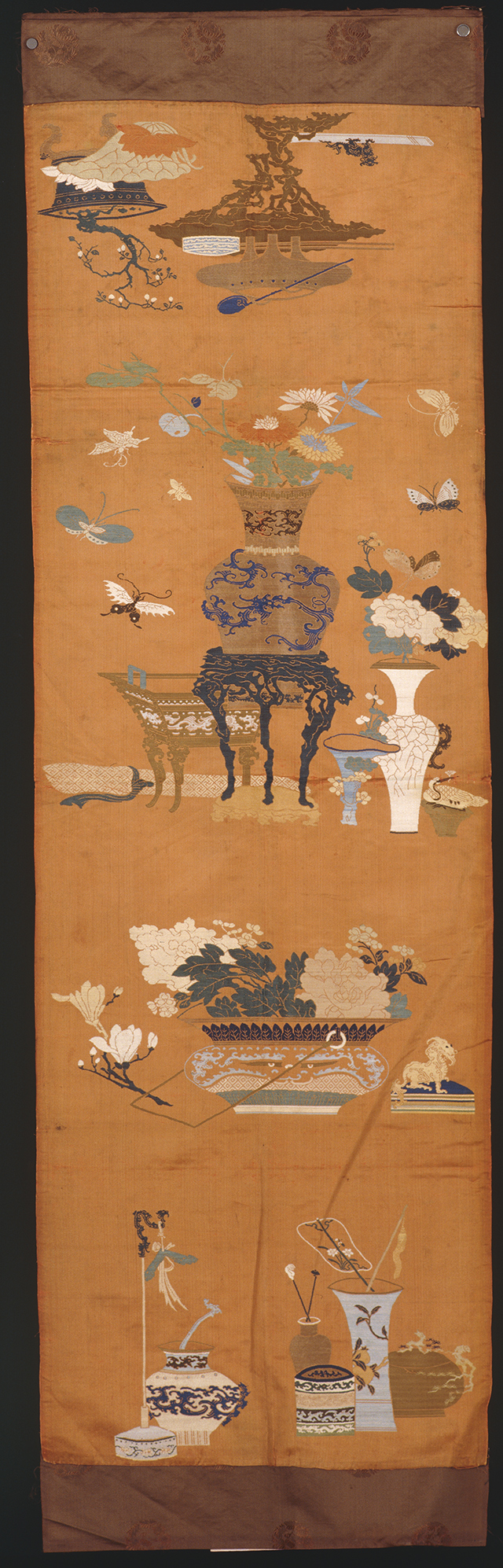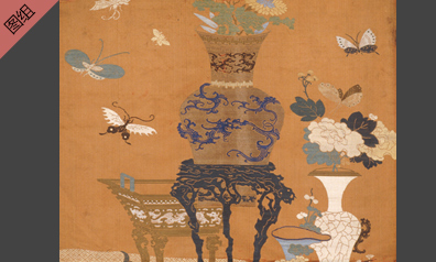 明清时期流行绘制集瓷、铜、玉、石等各种古器物于一图的博古图案,有时与花卉同绘,寓意清雅高洁,见于各类工艺品中,如意是这类图案中的常见组成部分。