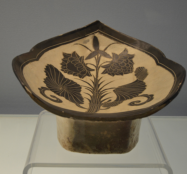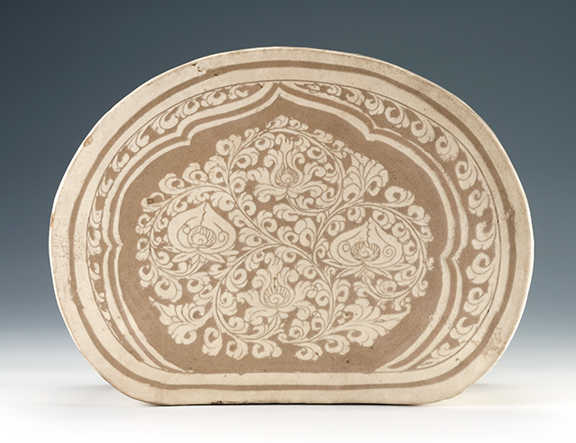 宋 磁州窑白釉黑彩刻莲纹枕残片