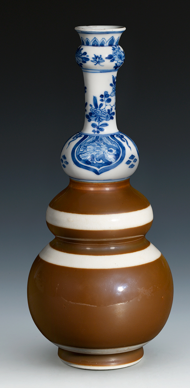 清 康熙景德镇窑酱色釉青花如意花卉纹葫芦瓶