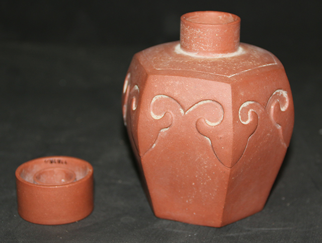 清 宜兴窑剔刻如意纹六棱紫砂罐