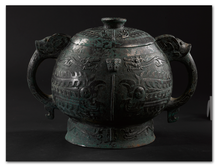 高22厘米 口径15.6厘米 石鼓山西周墓地4号墓出土 出土于8号壁龛。腹近球状,两侧分置兽首环状耳,垂珥卷曲,耳侧阴刻线图。圆形盖,隆起,顶端有圈状捉手。圈足较矮。颈部有龙纹一周,盖、器以凤鸟图案为主体,均以扉棱或浮雕兽首为中,呈对称状分布。这种凤鸟,体较短,圆睛尖喙,羽冠较长,状如飘带,尾羽长而尾尖下垂,末端分叉。云雷纹地细腻而无繁复感。此簋浑圆富态,制作精致,图案绝美,观感极舒,是青铜器中难得之精品,这种凤鸟图案,亦多见于宝鸡地区,当也体现地区特色。