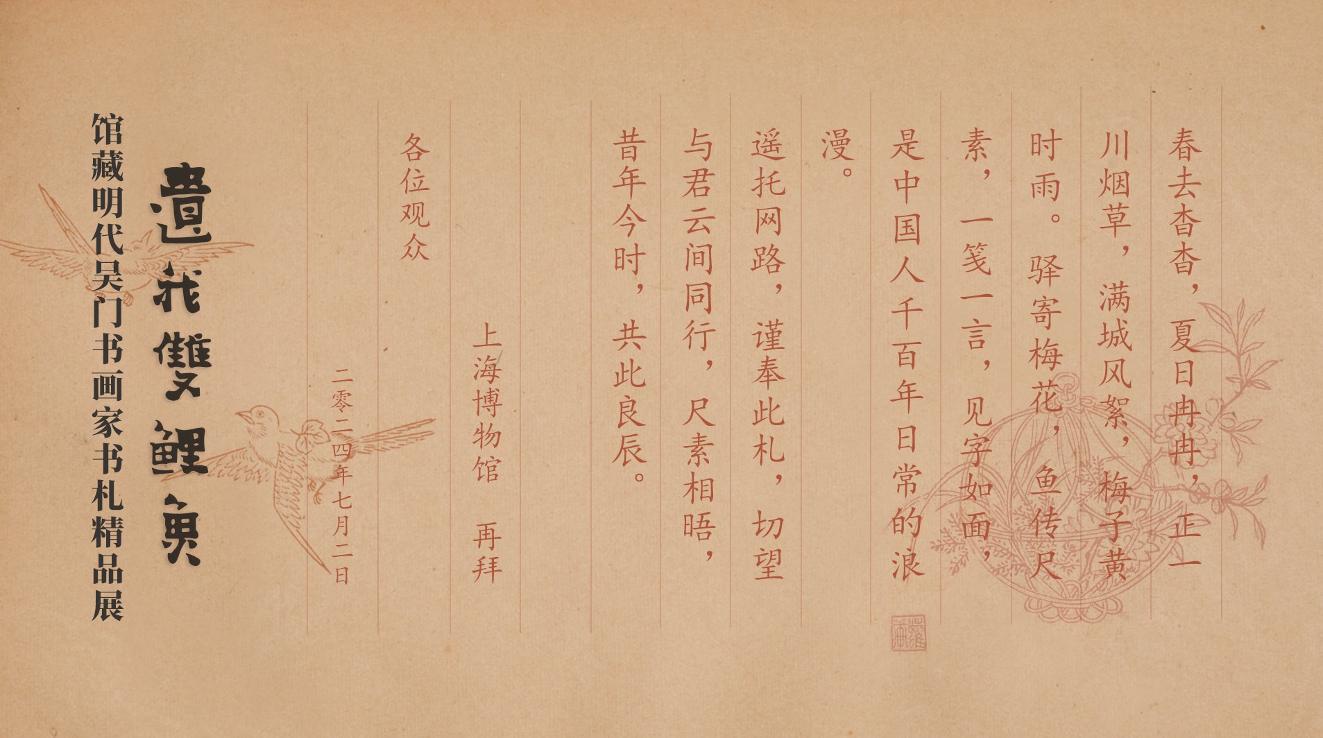 在中国古代,书信被喻为“锦鲤”、“飞鸿”、“青鸟”、“彩云”。书札,就是亲笔写的信札,它是人们互通消息的工具,也是承载一切美好感情的使者。展览遴选出馆藏明代著名书画家书札精品49通,分为“世俗生活”与“艺术世界”两部分。此次展览在整理研究的基础上,系统地展出明代吴门书画家的书札,具有历史与艺术的双重价值。