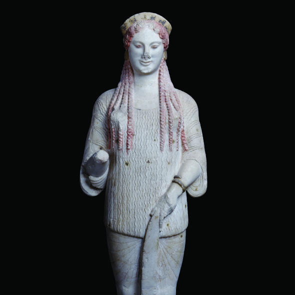 Today, two treasures from the Acropolis Museum travelled thousands of miles to come to us, full of grace and beauty. The statue of the Kore, a dedication to the sanctuary of Athena on the Acropolis depicts a young girl with a tender smile and beautiful clothes. Her appearance contains elements of movement and immobility, and shows the elegance of the women of ancient Athens.