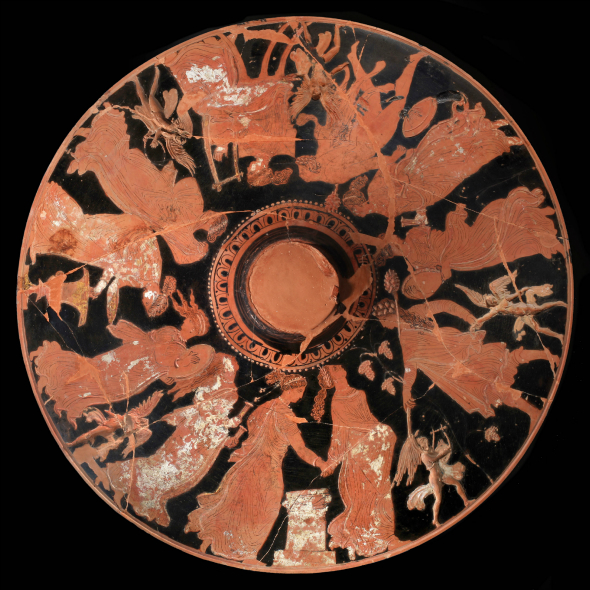 The Lekanis' lid depicts the god Dionysus in intoxicated celebration accompanied by Eros (cupids), a Satyr and Maenads. We can imagine the ecstatic sounds as they temptingly emerge from the scene on the lid as well as feeling the furious rhythms and hearing the piercing cries.