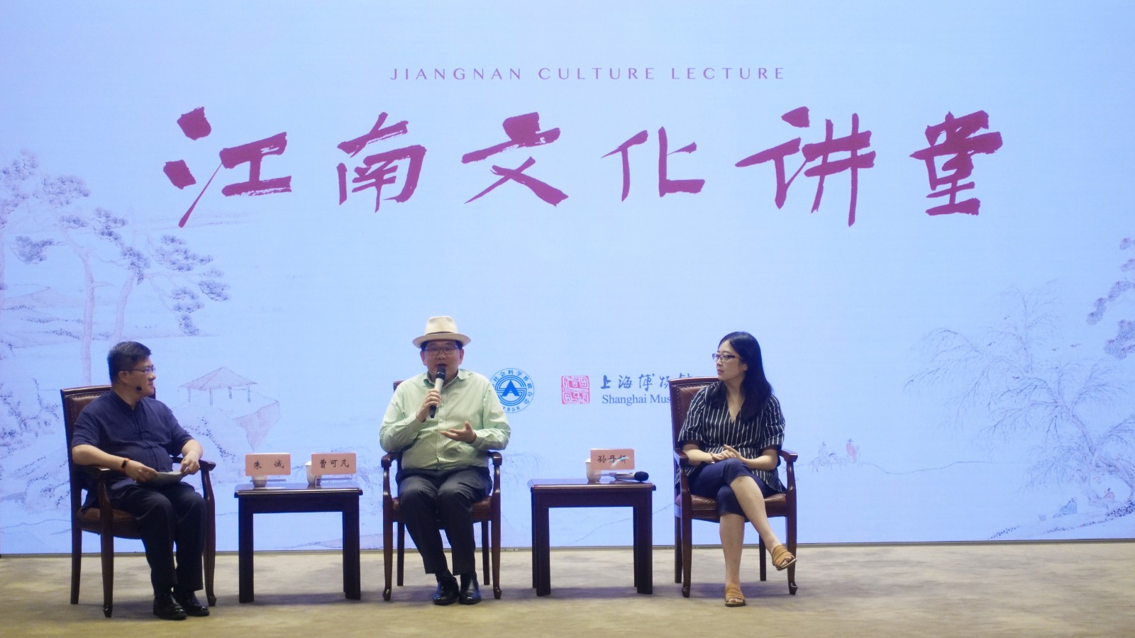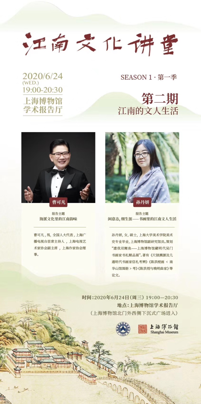 以“江南的文人生活”为主题的江南文化讲堂第一季第二期6月24日晚在上海博物馆成功举行。全国人大代表、上海广播电视台首席主持人、上海电视艺术家协会副主席、上海作家协会理事曹可凡和上海博物馆副研究馆员孙丹妍分别以“海派文化里的江南韵味”和“闲意态,细生涯—书画里的江南文人生活”为题,发表精彩演讲。