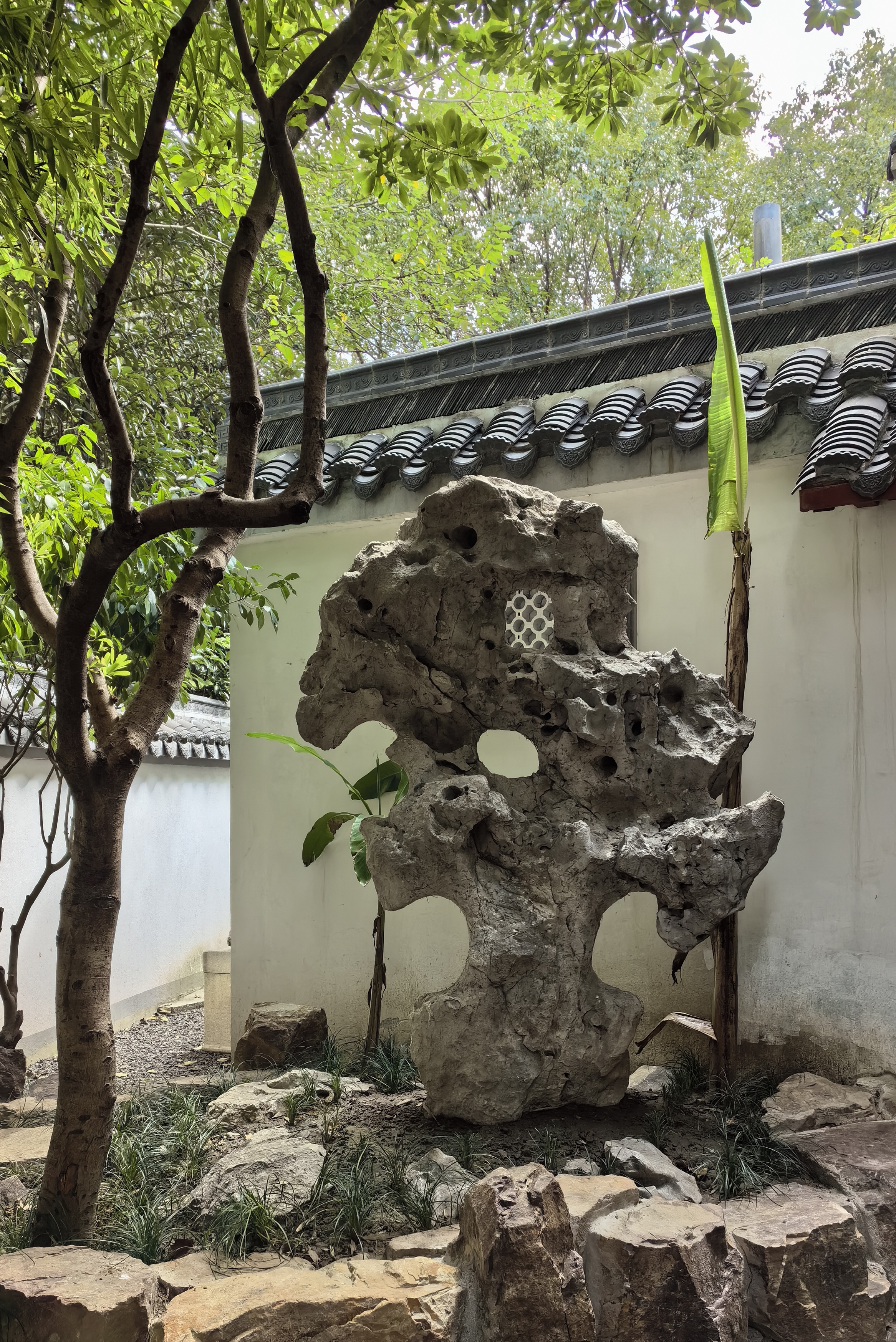 娄国平先生是我市一位民营企业家,业余时间热衷于古代赏石收藏。在其诸多奇石藏品中,有一件斥巨资购入的太湖石大立峰,高2.4米,宽1.7米,形体高大,形态完整而优美,表面风化严重,整体形态、孔洞与背部等处人工修治手法具有较早的时代特征。娄先生对此石十分珍爱,将其放置于自己的藏石别院“汇云峰馆”之前,并名之为“汇云峰”,以为院中之主。