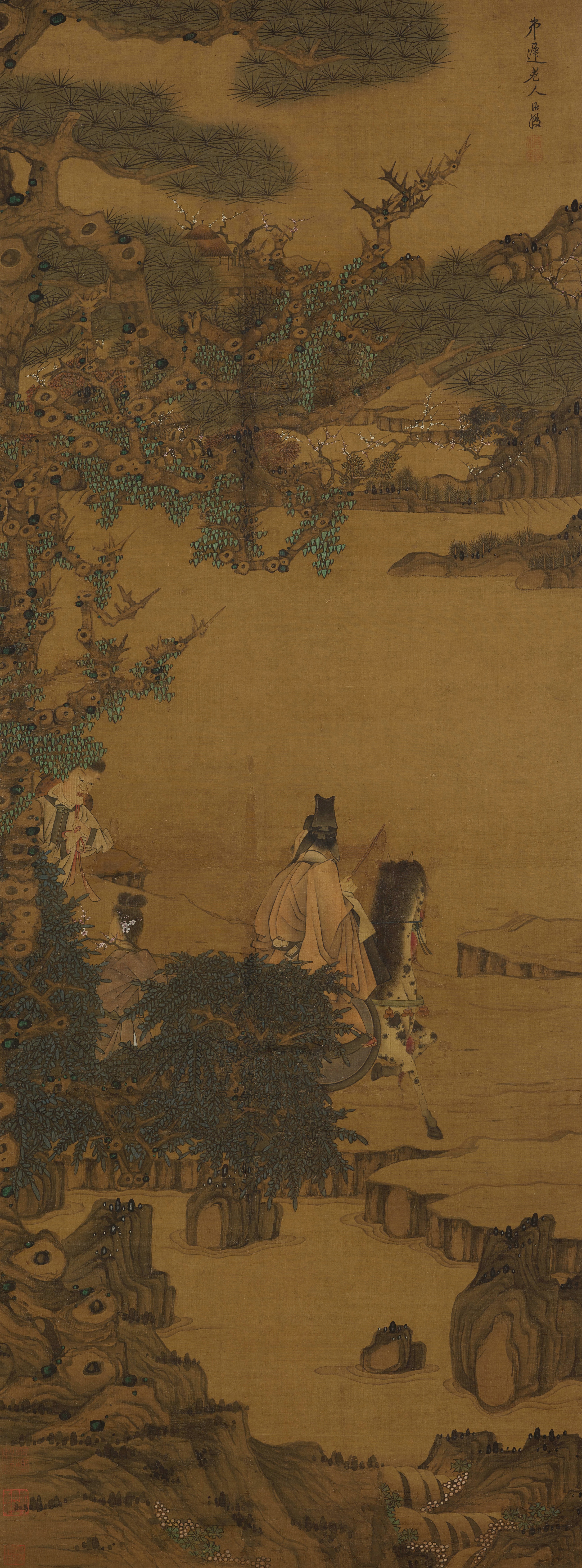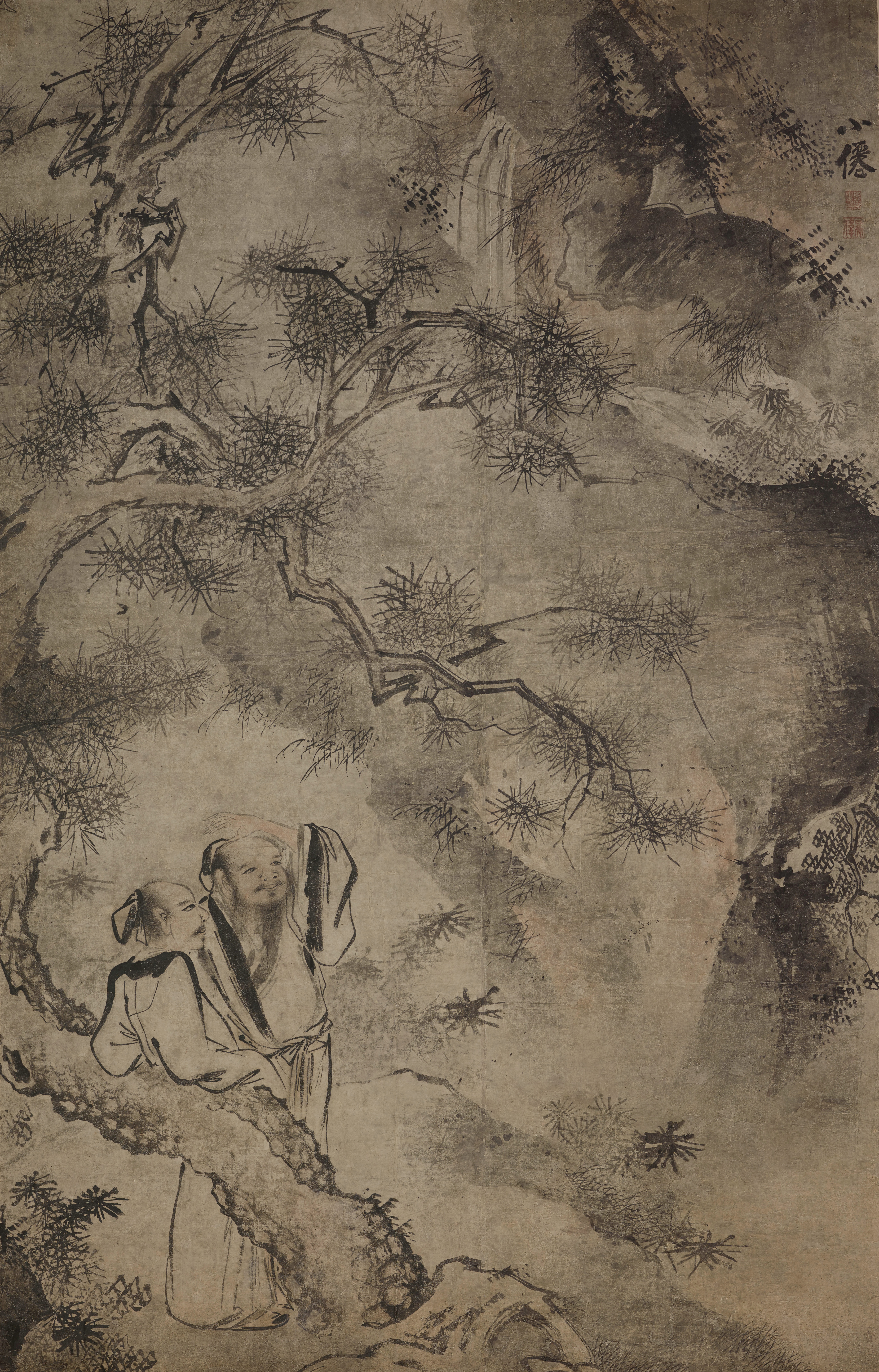 两件题款“小仙”和钤有“吴伟”印的明佚名作品《松下听瀑图轴》和《渔夫问道图轴》,画风显然嗣承明中期江夏派宗师吴伟,衹是笔致更为峭利和迅疾,细查画法,与传世浙派后学吴思恩的风格为相类。上博专家认为,此两图很可能出于吴思恩之手,虽非吴伟手迹,却是不可多得的江夏派后学之作。