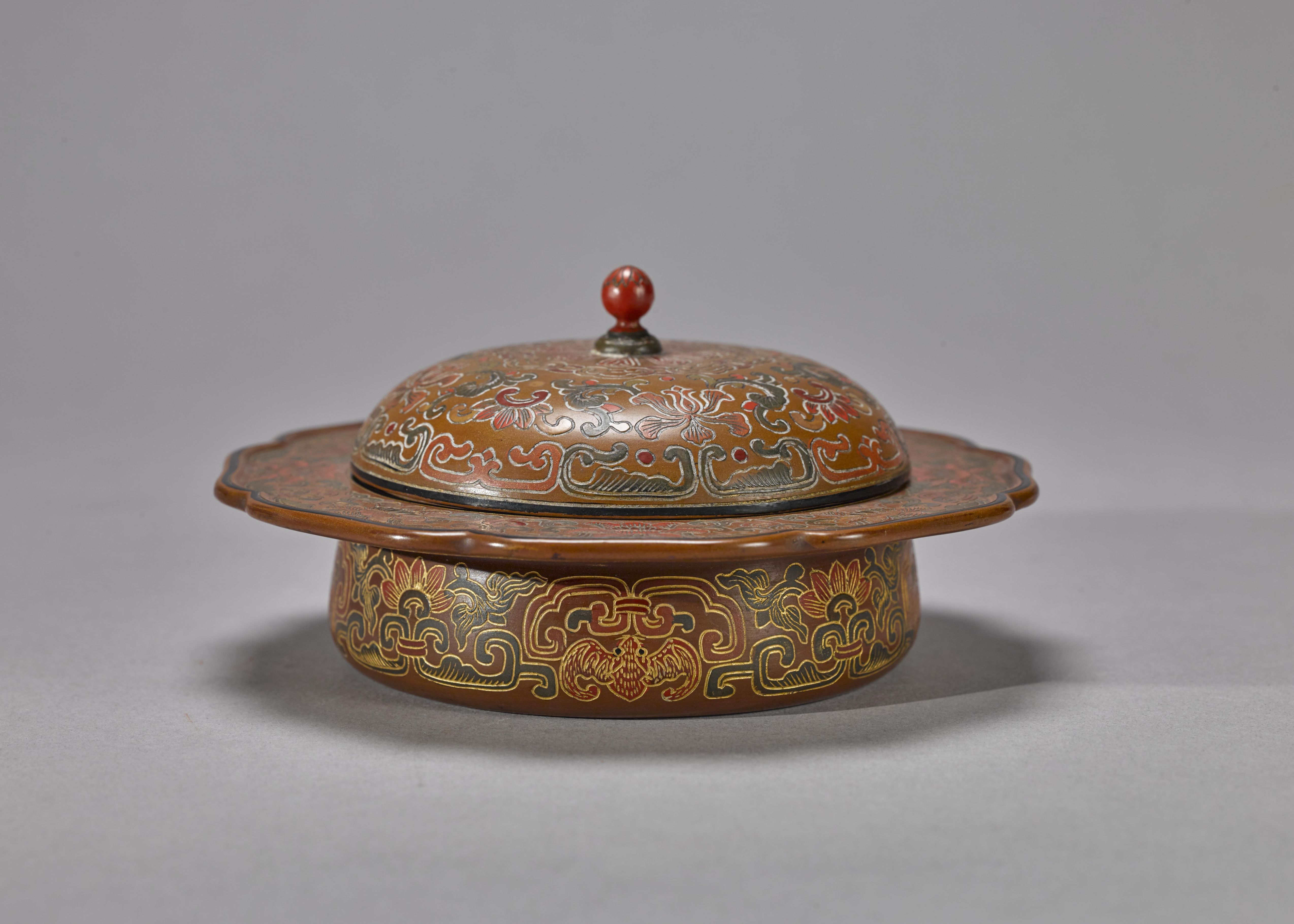 戗金彩漆莲蝠纹葵瓣形盖盂