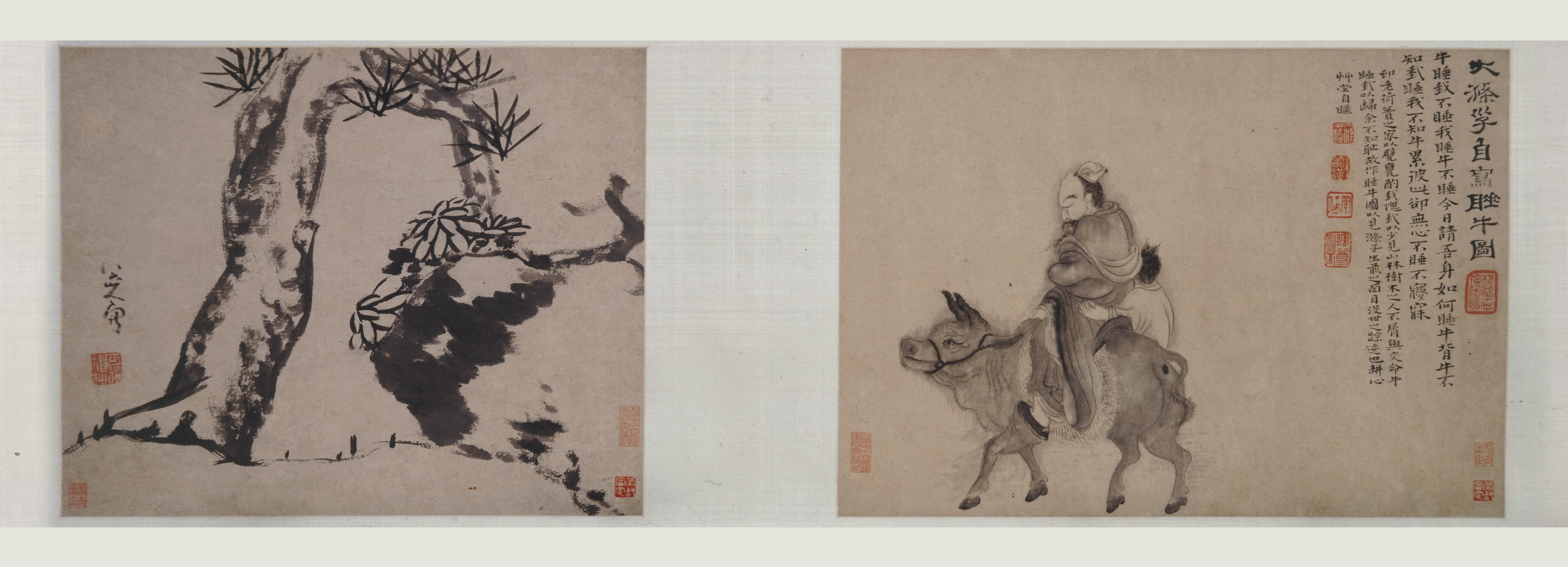 石涛 睡牛图、朱耷 书画合卷