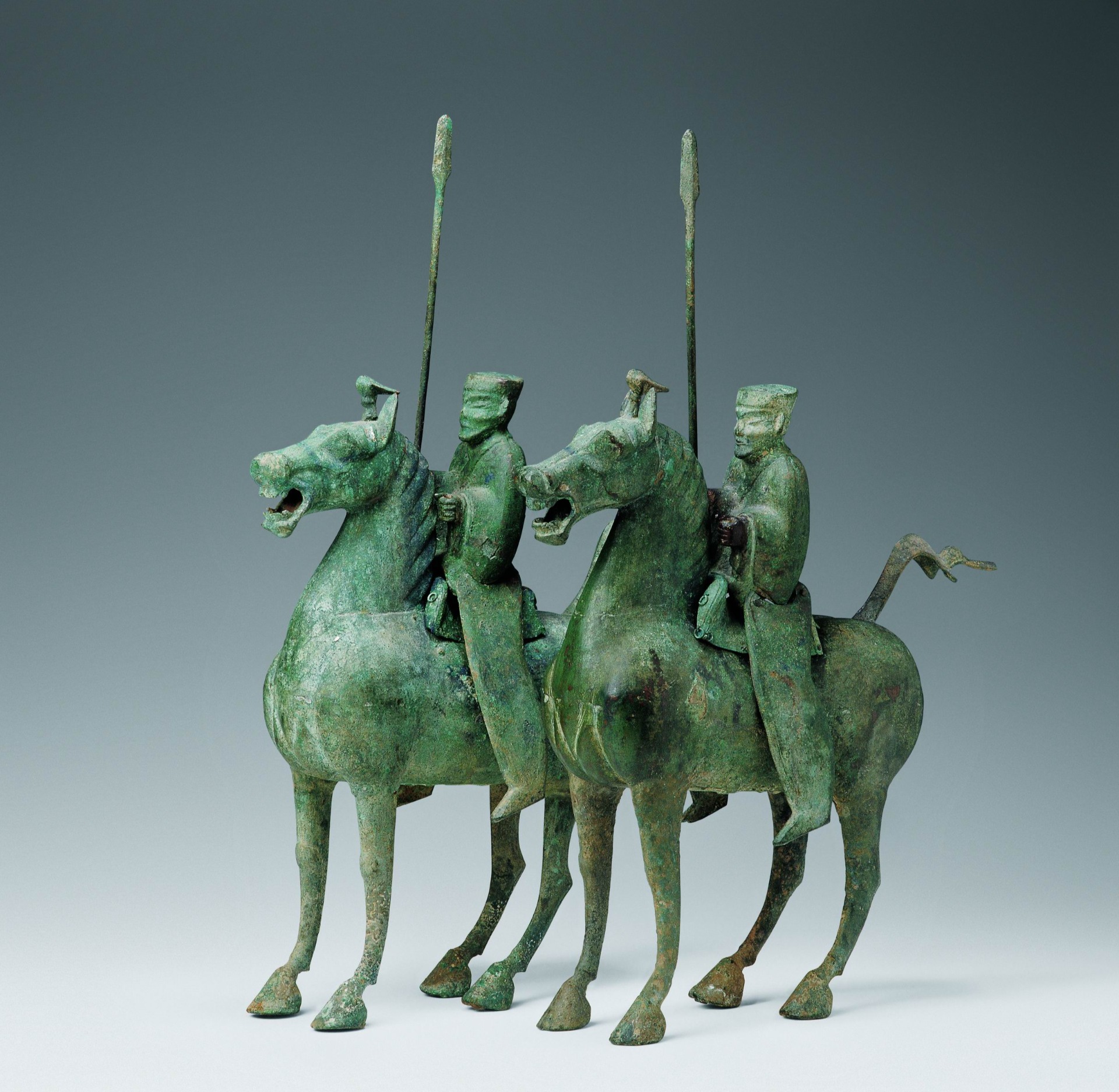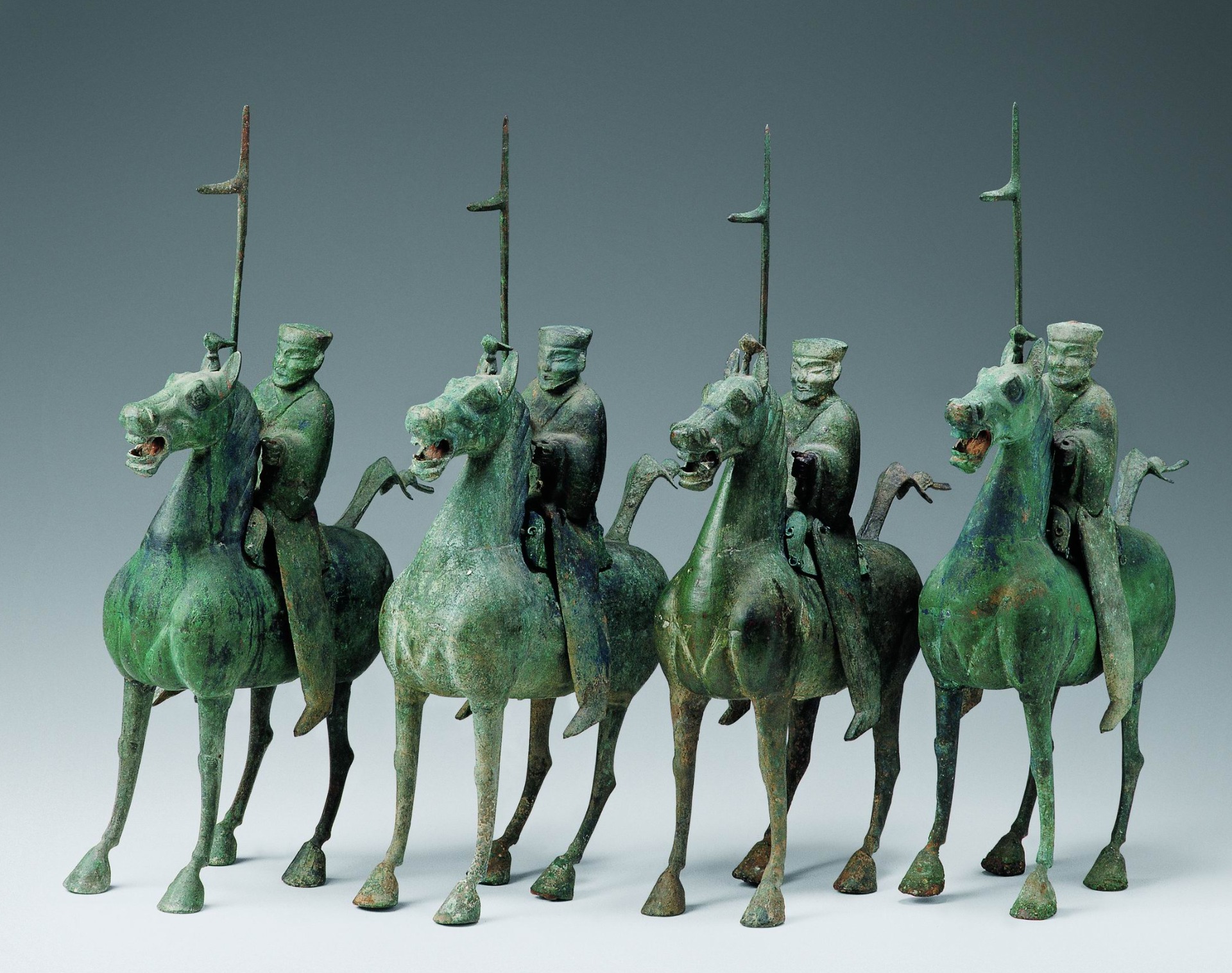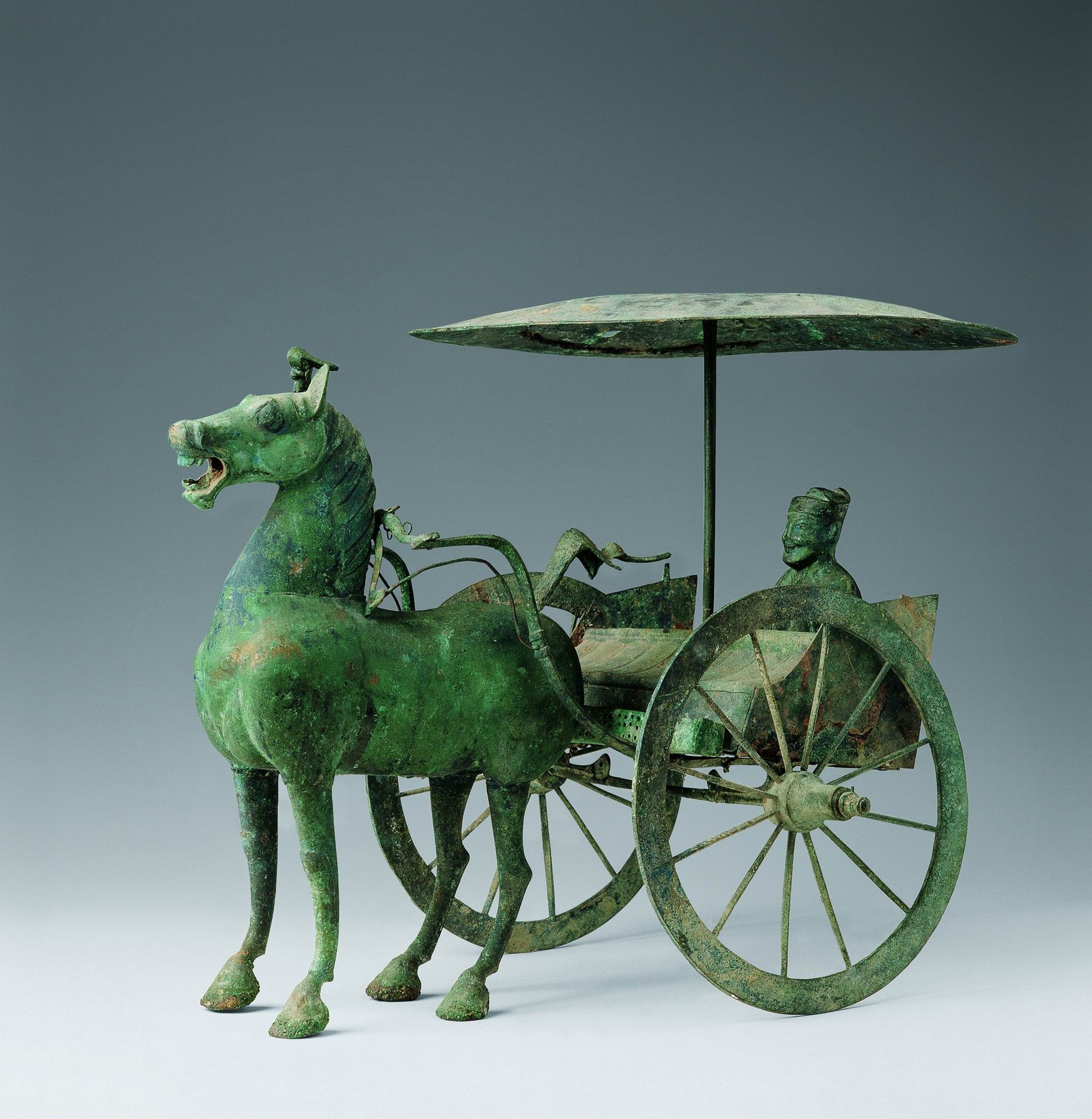 展览荟聚十六件组跨越千年的马主题文物。在此,您将邂逅与“马踏飞燕”同出于武威雷台汉墓的青铜车马,感受汉代车骑仪仗的赫赫威仪;欣赏凌空踏云的玉仙人奔马,品味汉代玉雕中的灵动神韵;近观出自吐谷浑墓葬的唐代骑马击鼓俑,领略丝路交往的生动瞬间;在徐悲鸿《饮马图》与张大千《临曹霸玉花骢图》中,体会墨韵流淌中的马魂风骨。
