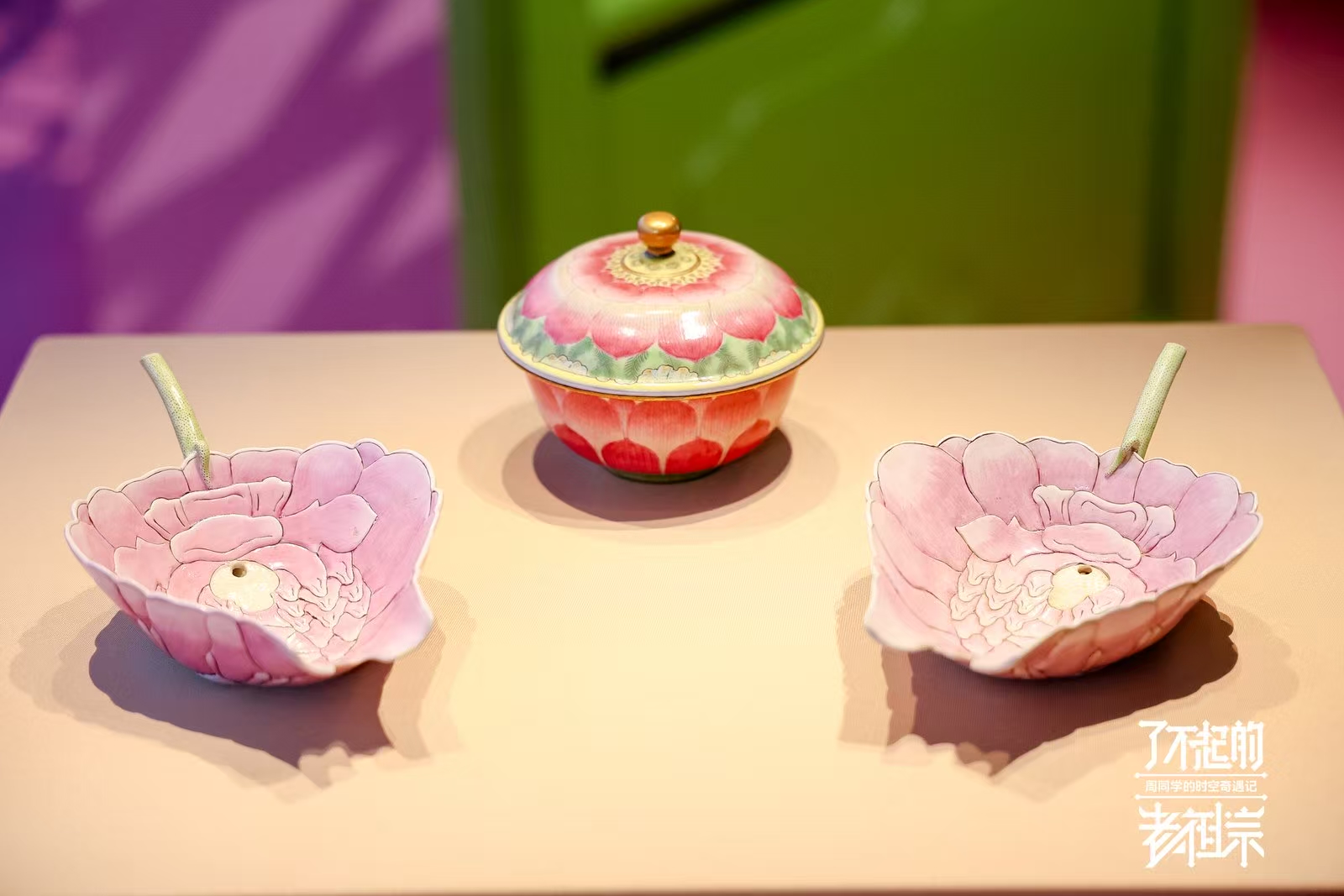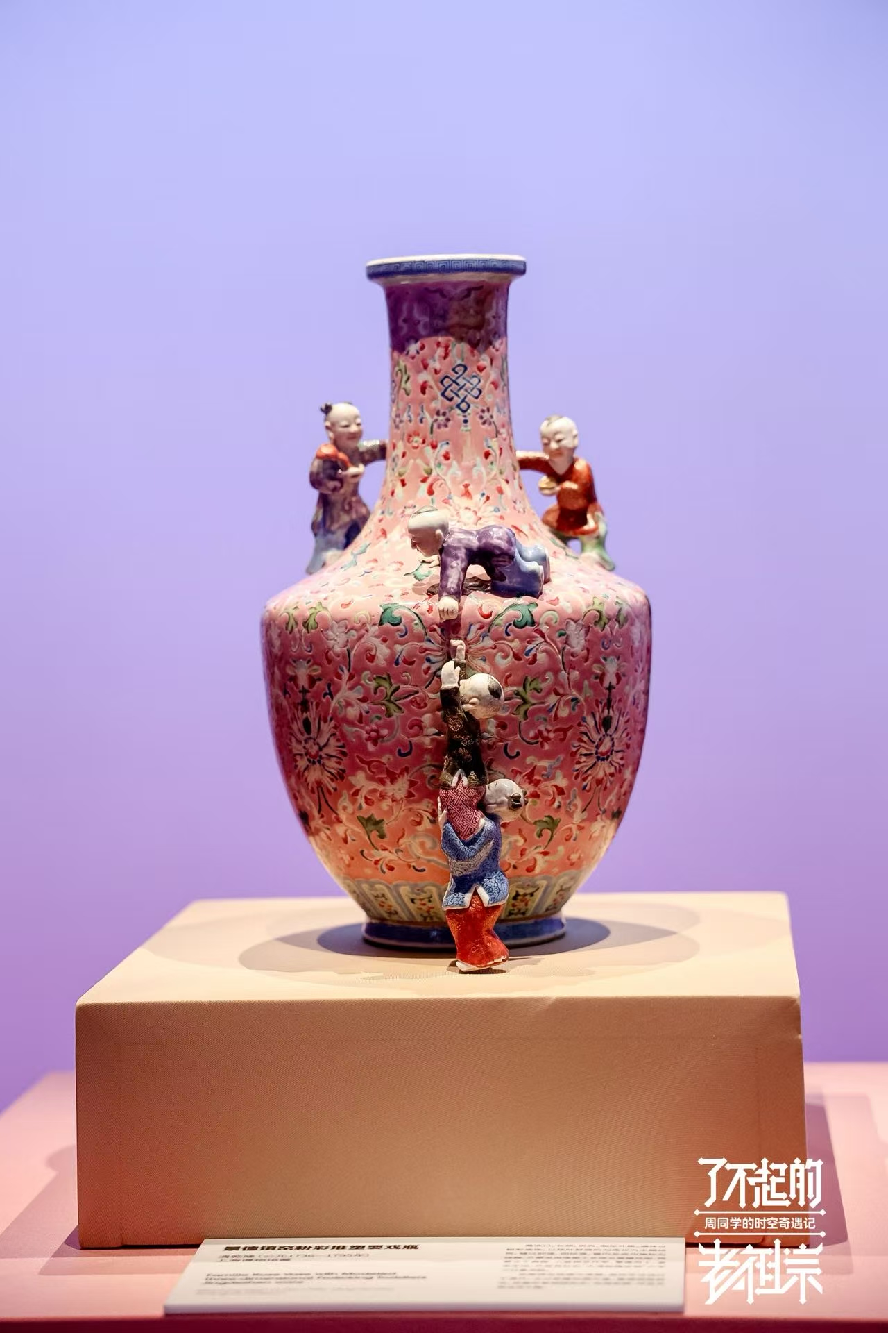 本次艺术秀并非将文物和IP简单罗列,而是真正让它们实现“对话”。 比如将四千多年前的“玉神人”,通过潮流转译,变成一个戴着未来感冠帽的“周同学”巨像投影,在“玉见未来”的未来考古概念展区展现中国玉石之美;将大克鼎的元素融入铠甲设计里,在“青铜跨时代”展区,青铜卫士周同学将守护着老祖宗的文化宝藏,古钱币造型创造出的10000张数字艺术收藏卡也将串联起古今未来对生活富足的美好期待;在“青花武馆”展区,上海博物馆馆藏的景德镇窑青花缠枝莲纹双耳瓶、景德镇窑青花折枝山茶纹扁壶等珍品悉数亮相,身绘青花瓷纹样的功夫机器人站上擂台,以灵动姿态演绎传统武术魅力,让非遗匠心与科技活力相融;“粉彩浪漫”展区则与周杰伦钟爱的粉色结合,聚焦清代乾隆年间的景德镇窑粉彩堆塑婴戏瓶、粉彩莲纹盖碗等粉彩珍品,让观众穿越时空,对话粉色浪漫。