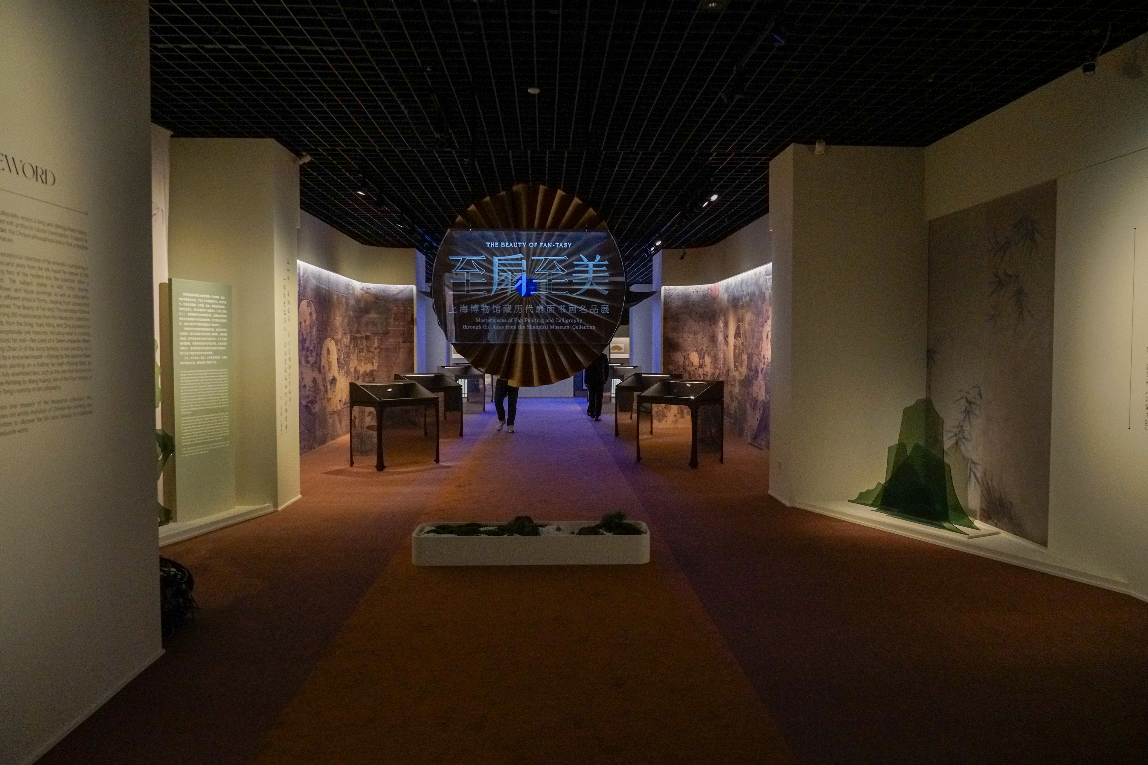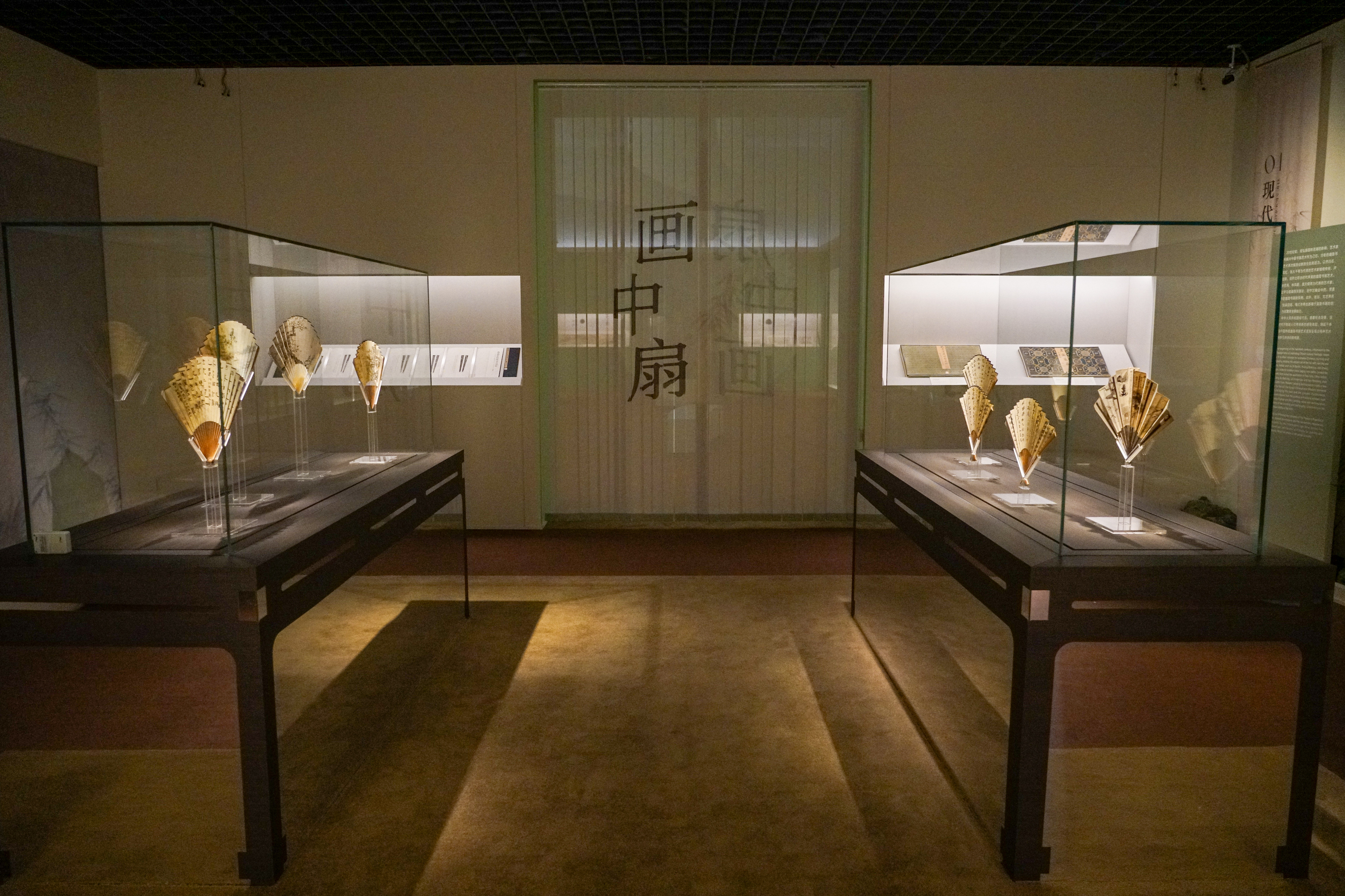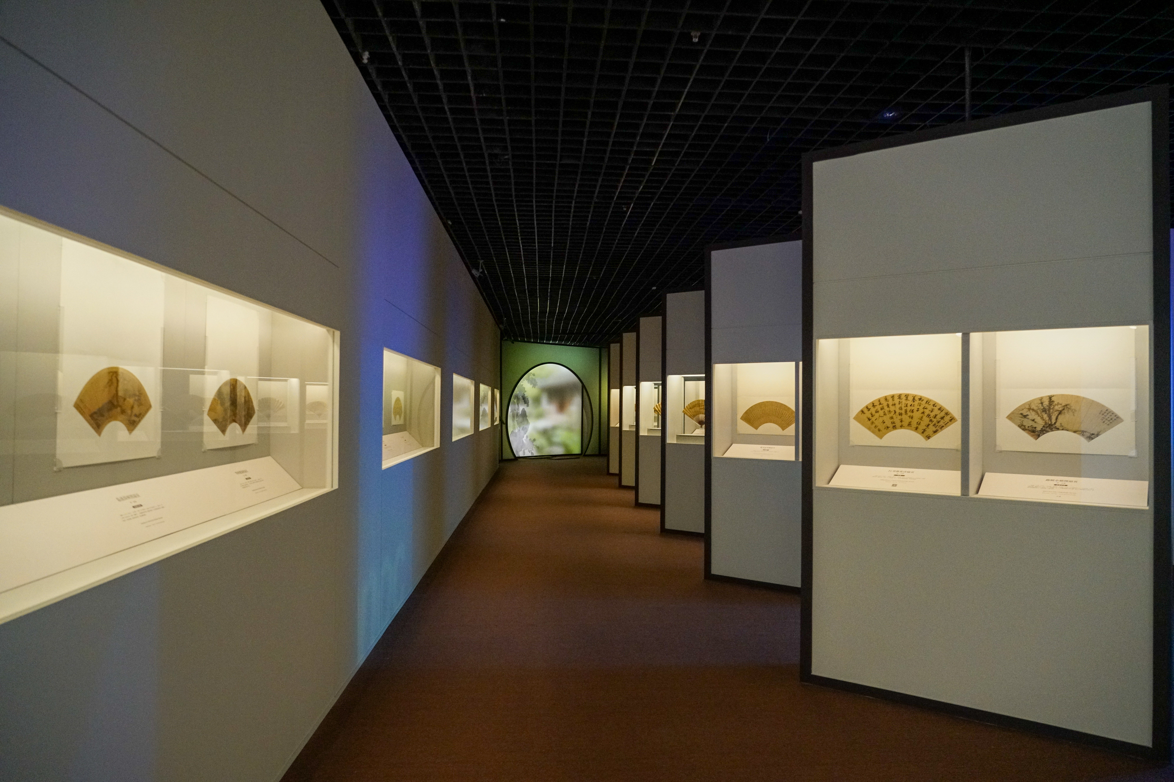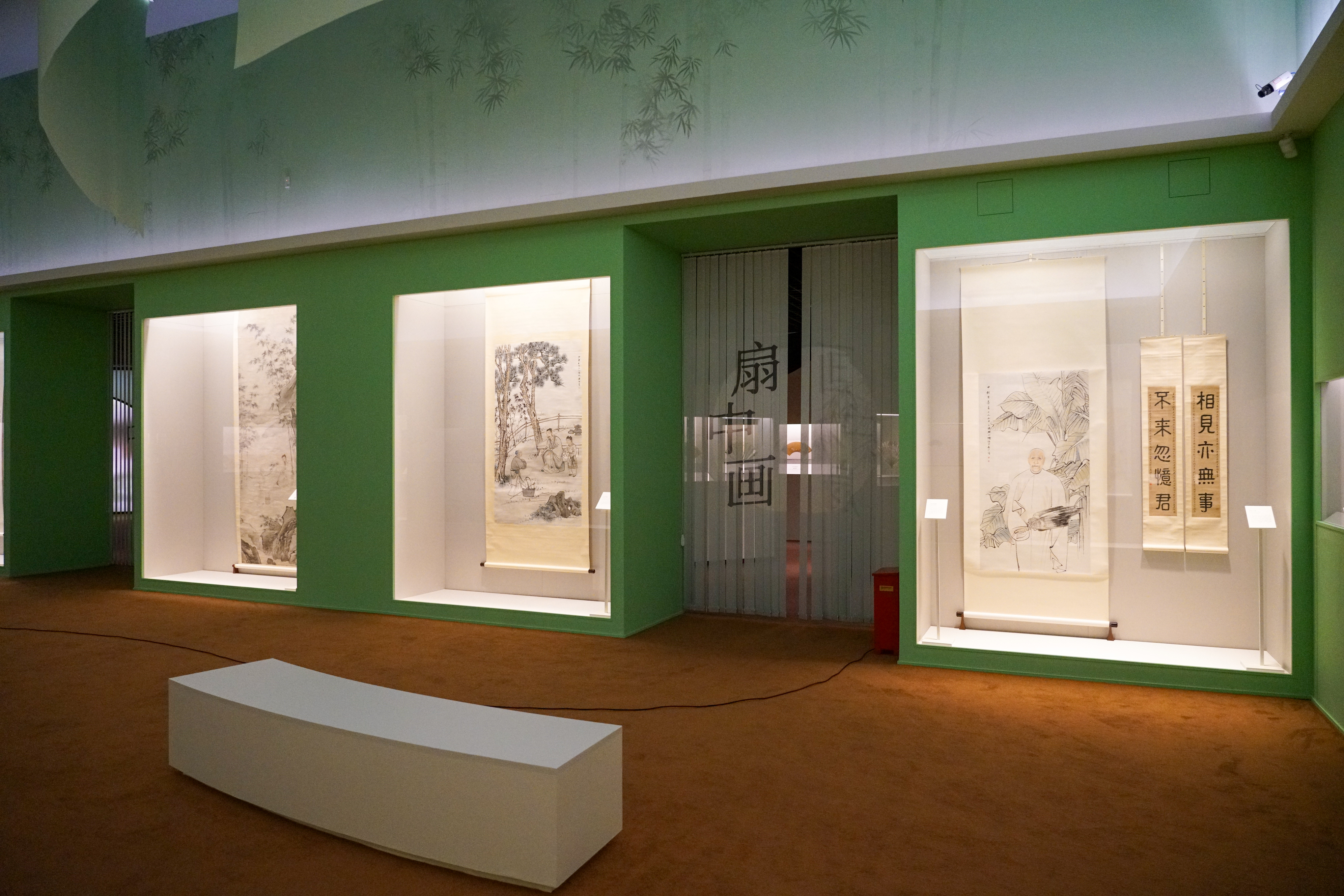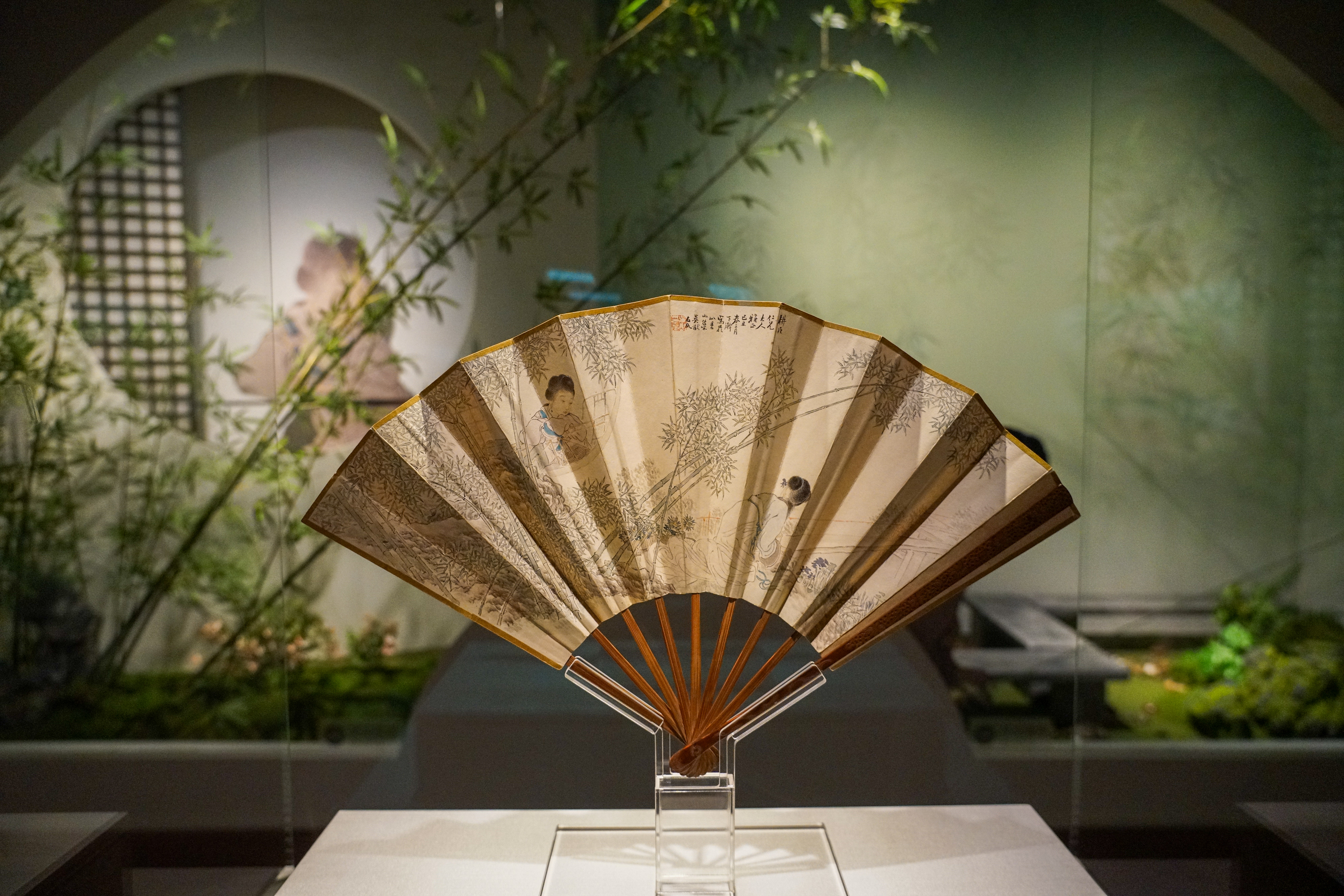 本次展览的展陈空间依据主、辅线展品的特性与时代艺术风格进行设计。主线展示聚焦扇面书画的发展脉络,空间设计融入宋式建筑、明清园林及文人书斋的美学理念,通过由大到小、由外及内的空间序列,形成连贯的观展流线。辅线展品以立轴、手卷等形式,呈现绘画中的扇文化内涵,其展示设计以“竹”为视觉元素,营造清雅意境,突出扇文化所蕴含的文人精神追求。主、辅展线在空间中穿插呼应,实现内景与外景的巧妙联动。