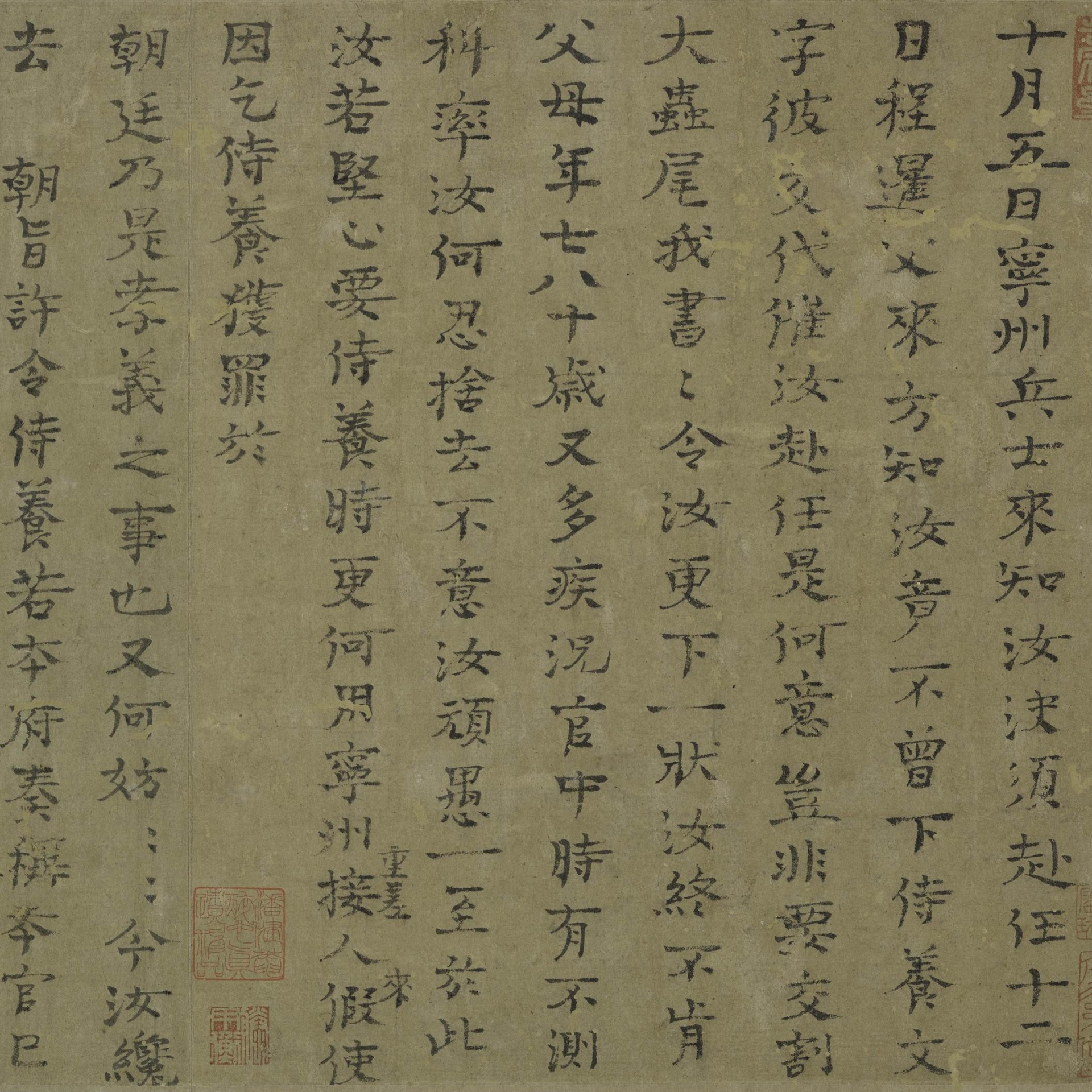 Sima Guang (1019-1086), also known by his zi (designated name) Junshi and his hao (literary name) Yusou, was also called Sushui Xiansheng. He was native to Xia county of Shanzhou (present-day Xia county, Shanxi province). He became a jinshi (a successful candidate in the imperial examination) in the first year (1038) of the Baoyuan era. He was the chief of Shangshusheng (Department of State Affairs). He was skilled in calligraphy, excelling in seal and clerical scripts. This is a personal letter to his nephew, Sima Fu, advising him to resign from his official post to care for his parents. It was written in the eighth year (1085) of the Yuanfeng era, when the author was 67 years old.