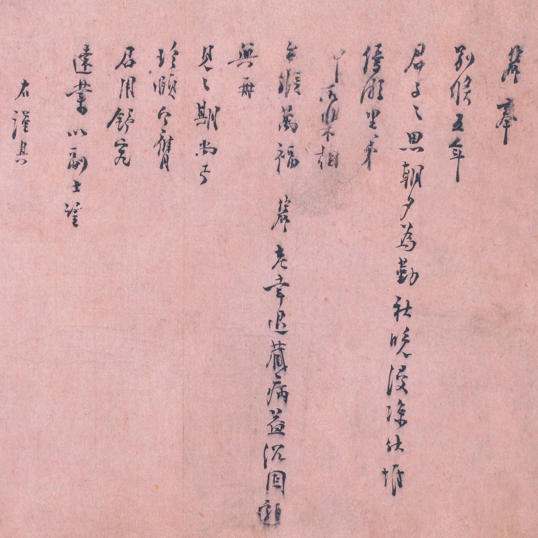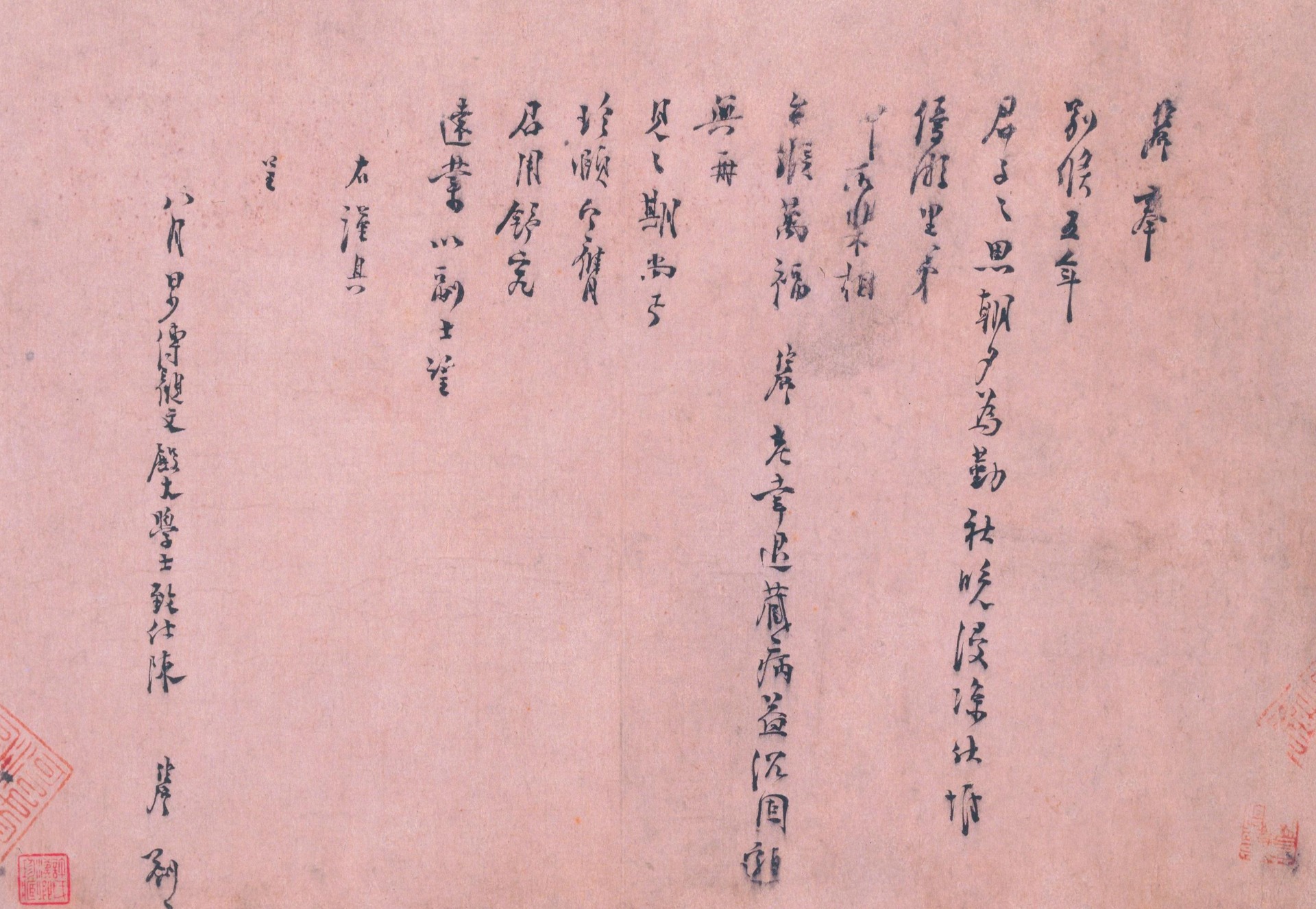 Chen Junqing (1113-1186), also known by his zi (designated name) Yingqiu, was a native of Putian in Fujian. He became the bangyan (second place in the imperial examinations) of the eighth year (1138) of Shaoxing era, and rose to the Vice Director of Shangshusheng (Department of State Affairs). Skilled in regular script, he learned after Ouyang Xun and Yan Zhenqing. This letter, addressed to a friend, discusses his retirement and recovery from illness. The brushwork is mature, robust, and elegantly refined. It is a work from his late years.