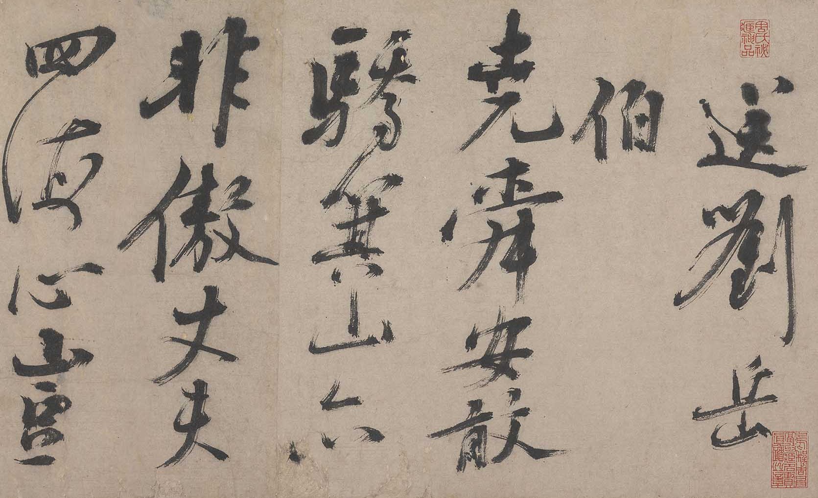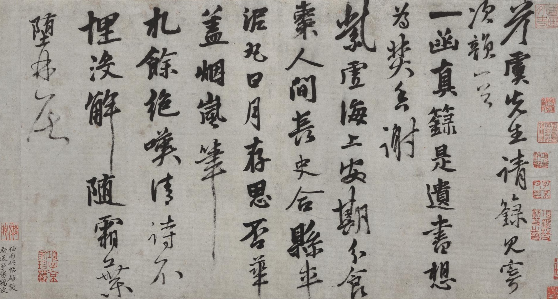 Chen Xianzhang (1428-1500), native to Xinhui in Guangdong, is also known by his zi (designated name) Gongfu and hao (literary name) Shizhai. He was also known as Baisha Xiansheng. This handscroll contains several farewell poems composed by the artist for his friends, including Liu Daxia, Xia Sheng, and Xue Gang. The brushwork is vigorous, powerful, and resolute, with dry strokes and "flying-white" effects (accidental blank spaces within the ink brushstrokes) that evoke an untrammeled natural charm. It is a representative masterpiece from his late period.