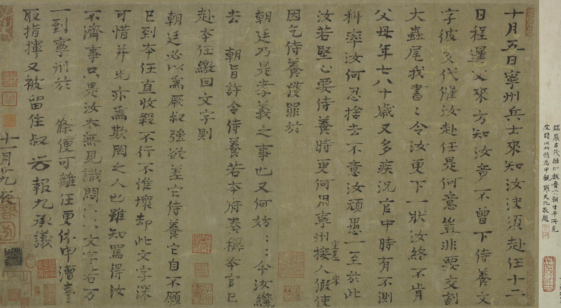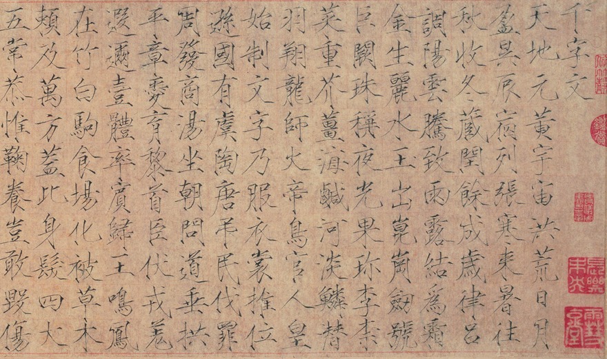 Zhao Ji (1082-1135), Empeor Huizong of the Song, was also known by his hao (literary name) Xuanhe Zhuren. As a painter and calligrapher, he was skilled in regular and cursive scripts. He integrated styles of Chu Suiliang and Xue Yao in his regular script, establishing a distinctive style he termed "shoujin script". This handscroll is his transcription of One Thousand Character by Zhou Xingsi of the Liang dynasty, awarded to the eunuch Tong Guan. The brushwork is crisp and vigorous, suffused with an air of elegant ease. It was written in the third year (1104) of the Chongning era, when the artist was 23 years old.