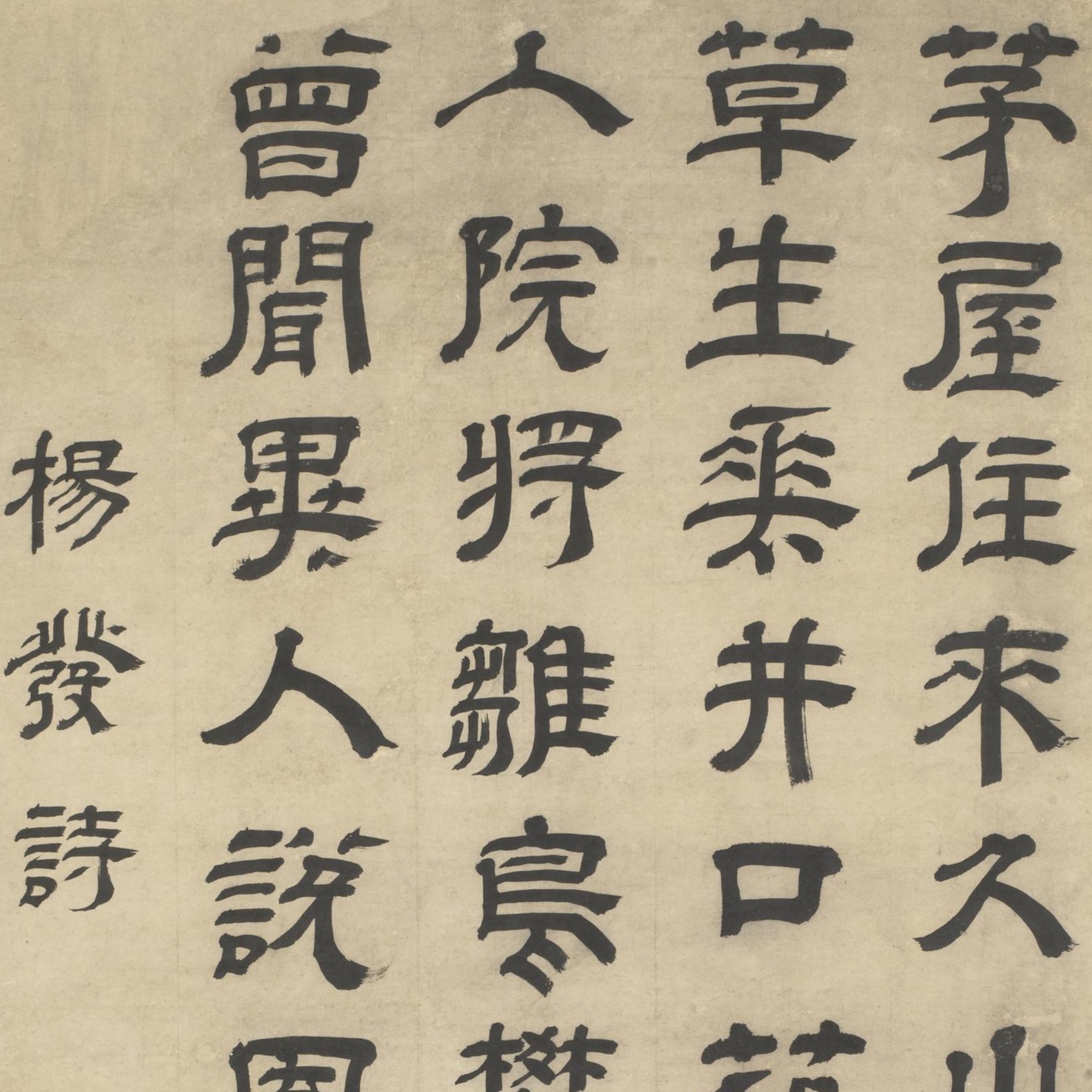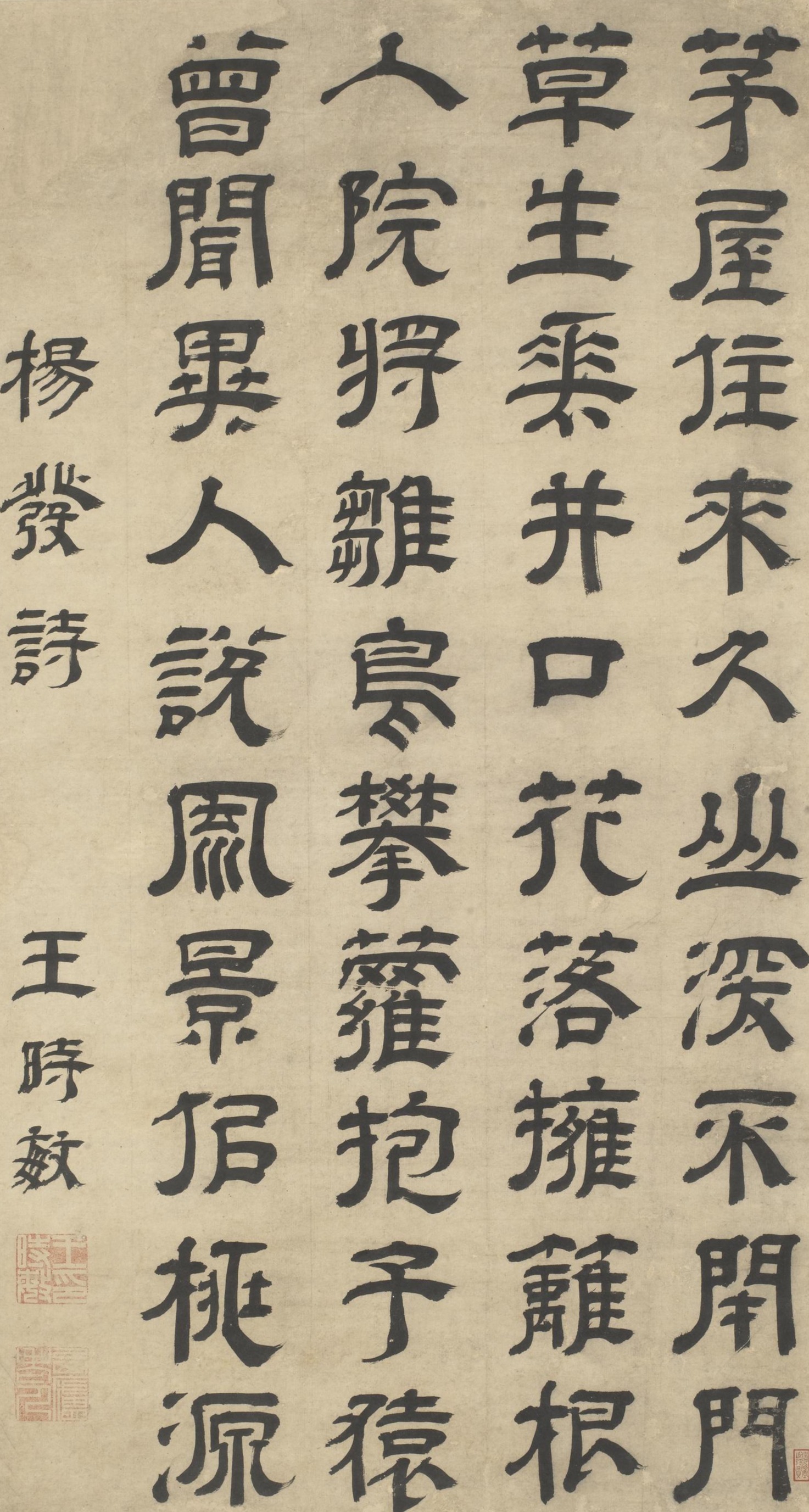Wang Shimin (1592-1680), also known by his zi (designated name) Xunzhi and hao (literary names) Yanke and Xilu Laoren, was a native of Taicang, Jiangsu. He served as a minister of Taichangsi (Department of lmperial Rituals) in the Ming dynasty but declined official position in the Qing dynasty. A master of landscape painting and one of the "Six Masters of the Early Qing", he was also skilled in clerical script. This scroll is a transcription of Yang Fa's poem The Nanxi Academy from the Tang dynasty. The brushwork is thick yet dynamic while the characters are squarely structured, showcasing a masterful balance of strength and elegance.