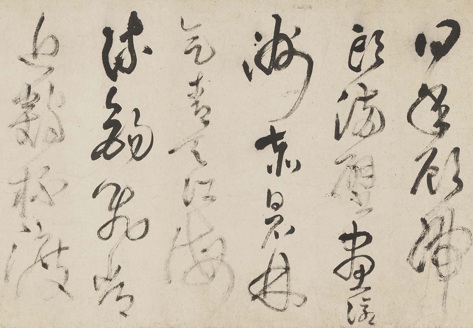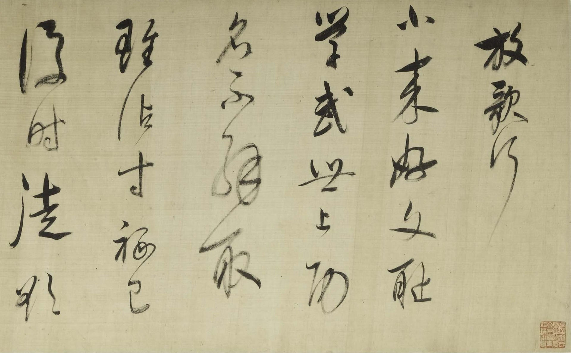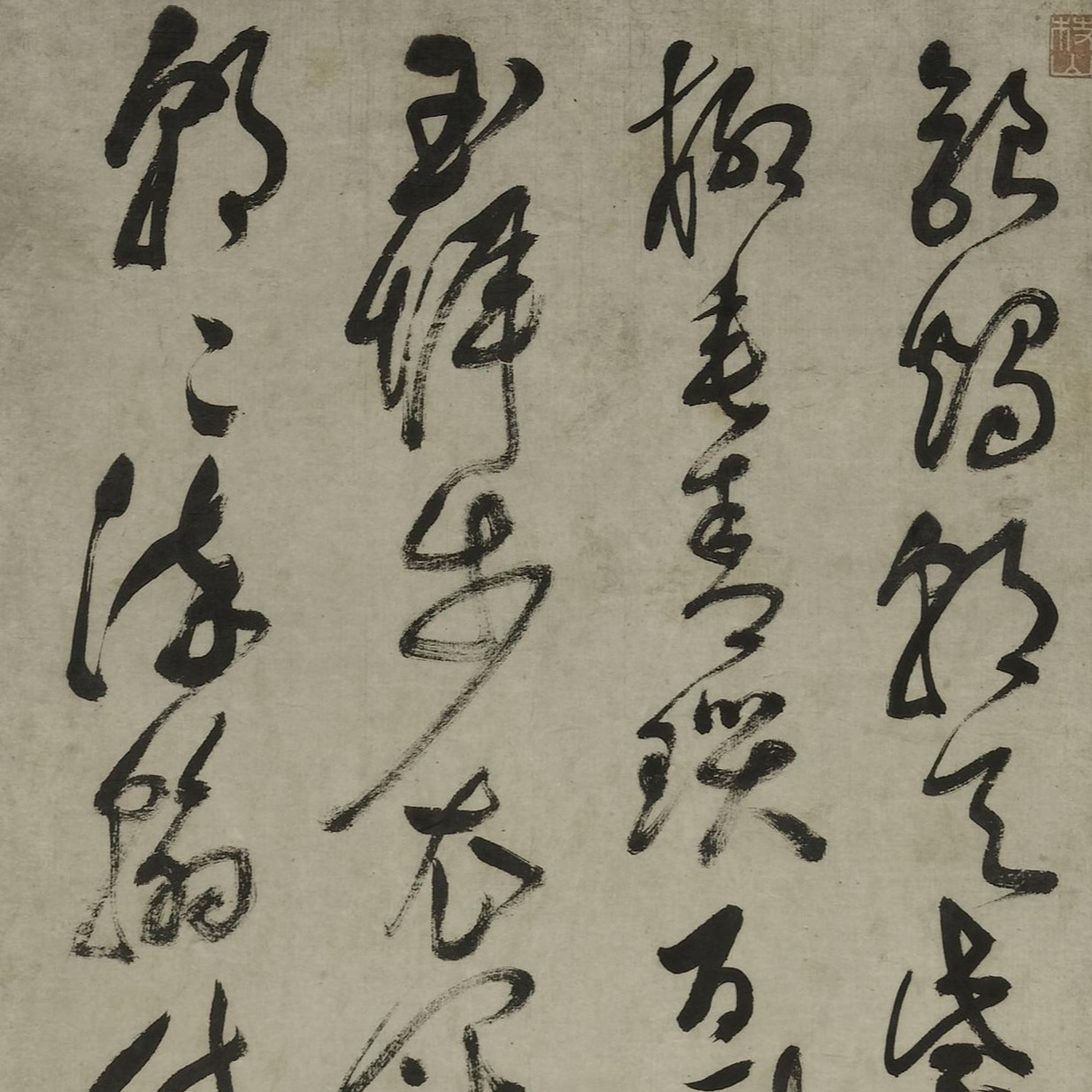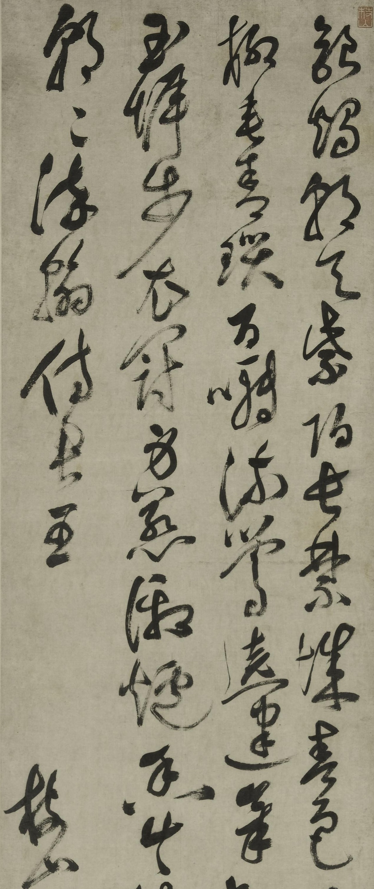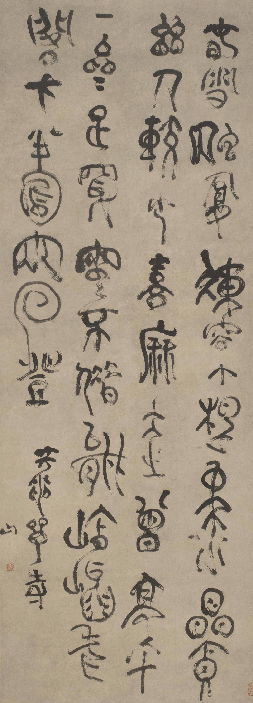 Fu Shan (1607-1684), also known by his zi (designated name) Qingzhu and his hao (literary name) Zhenshan, was native to Yangqu (present-day Taiyuan, Shanxi province). He was a philosopher, calligrapher, and physician during the late Ming to the early Qing. He was adept in all scripts, especially skilled in cursive script. This hanging scroll transcribes his own poem Tianlong Temple in a cursive-seal script. It blends ancient and his contemporary calligraphic style, with brushwork that is powerfully expressive and unrestrained.