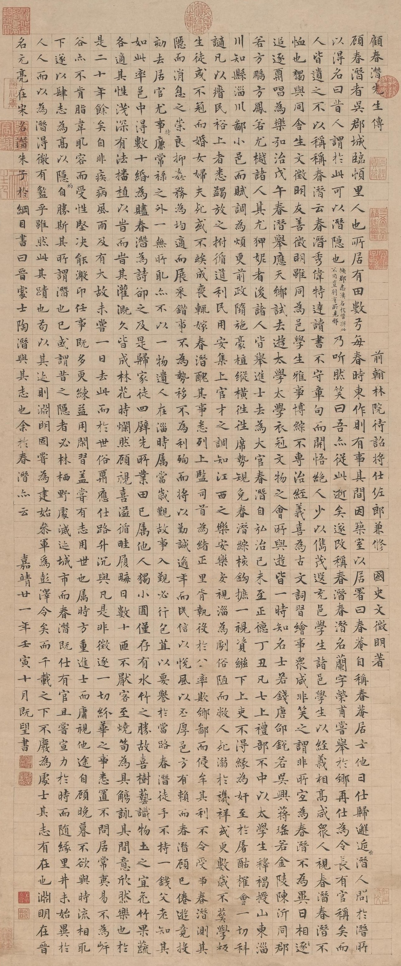Wen Zhengming (1470-1559), original name Bi, is also known by his zi (designated name) Zhengzhong and hao (literary names) Hengshan and Tingyunsheng. A native of Changzhou (present-day Suzhou, Jiangsu province), he was skilled in painting and calligraphy, especially adept in smaller regular script. Gu Chunqian is also known as Gu Lan. This hanging scroll demonstrates exquisite brushwork, a balanced structure, and an elegant synthesis of vigor and classical refinement. This work was written in the 21st year (1542) of the Jiajing era, when the artist was 73.