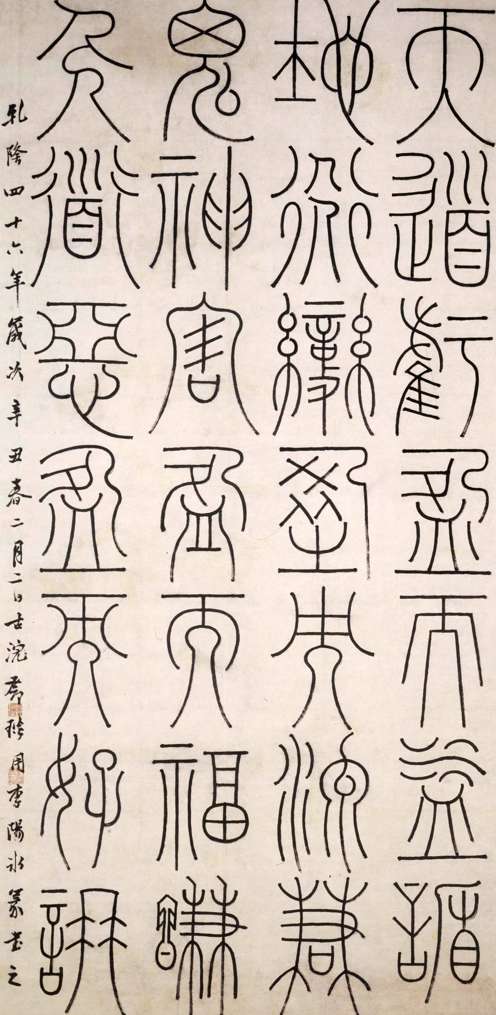 Deng Shiru (1743-1805), originally named Deng Yan and with zi (designated name) Shiru, was a native of Huaining, Anhui. To avoid using the personal name of the Jiaqing Emperor, he later went by his later zi Wanbo and hao (literary name) Wanbai Shanren. A master of calligraphy and seal carving, he was particularly renowned for his seal and clerical scripts. The brushwork of this scroll is robust and upright; the characters are balancedly composed yet full of variation. The scroll was written in the 46th year (1781) of the Qianlong reign, when the artist was 39.