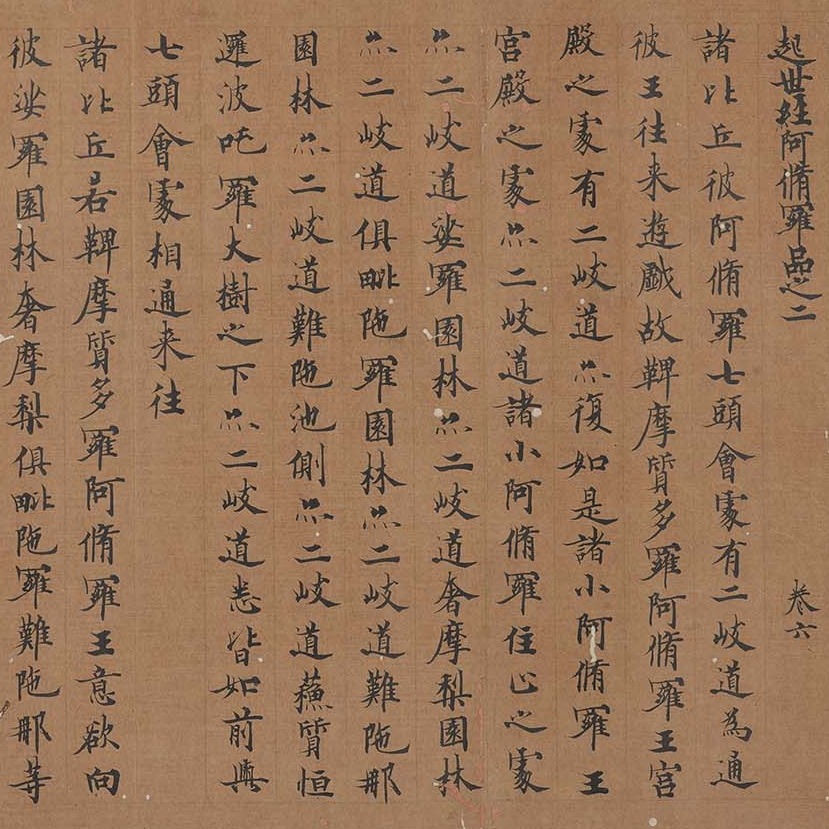 Dunhuang Manuscripts, unearthed from the library cave at the Mogao Caves, comprise tens of thousands of documents dating from the Jin to the Song dynasties. This manuscript is a Tang dynasty copy of the sixth volume of the Qi Shi Jing (Sutra on the causes and beginning of the world), translated by the Indian monk Jñānagupta and others during the Sui dynasty. It is written on processed paper soaked with cork-tree sap. The brushwork exhibits rigorous discipline, combining dynamic strength with an ethereal grace, closely resembling the calligraphic style of Ouyang Tong's Stele for the Master Monk Daoyin. This manuscript represents a rare surviving example of the Ouyang style calligraphic among Tang dynasty sutra transcriptions.