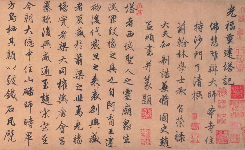 Zhao Mengfu (1254-1322) is also known by his zi (designated name) Zi'ang and hao (literary name) Songxue Daoren. A native to Wuxing (present-day Huzhou, Zhejiang province), he was a Hanlin scholar (the emperor's literary retinue). Adept in calligraphy, he was skilled in all scripts and led a profoundly influential trend in the art of calligraphy. This handscroll is the record of Rebuilding the Guangfu Pagoda by the monk Liaoqing. The brushwork is rounded and vigorous yet elegant, conveying a sense of harmony and serene subtlety. It was written in the first year (1321) of the Zhizhi era, when the artist was 68 years old.