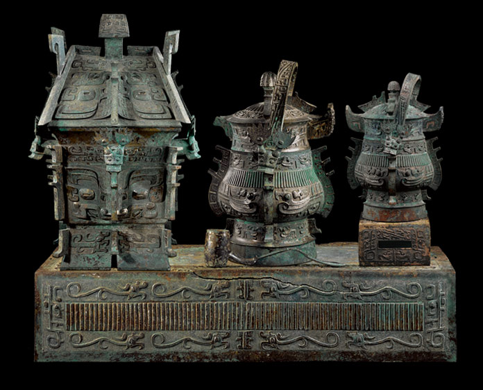 该组器物发现于三号墓3号壁龛,出土时大铜禁位于壁龛西底部放置,其上的器物有户方彝一件、户卣有大小两件,与小户卣配套的小龙纹禁一件,用于挹注的兽首纹斗一件。