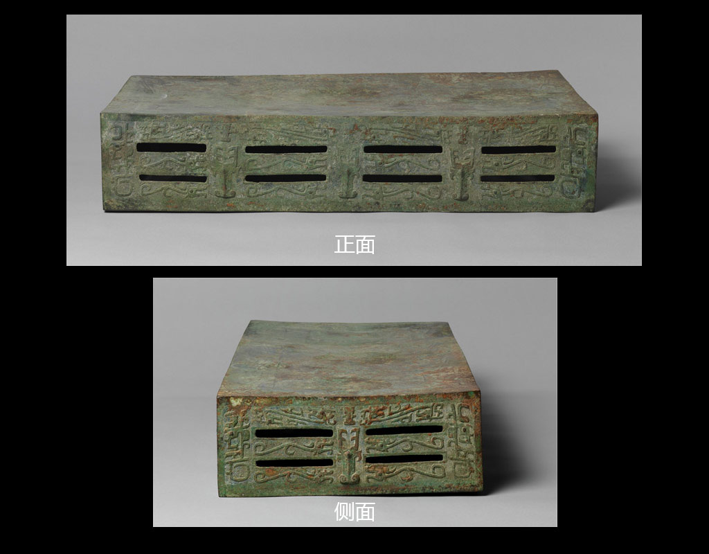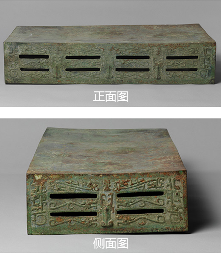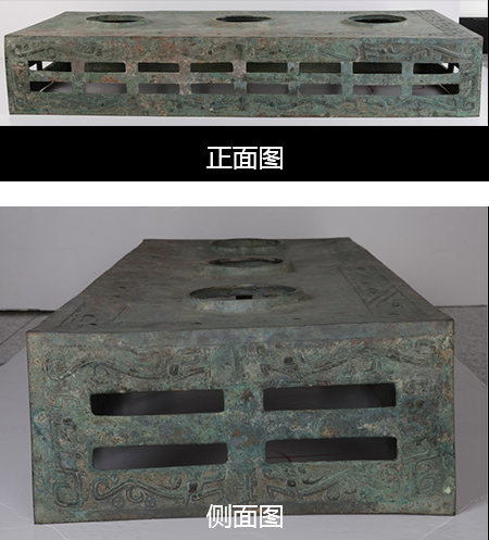 长方形台座,两侧有上下各八共十六个长方形孔,两端有上下各二共四个长方形孔。四面边框饰瘦长型尖角龙纹,两侧上下各有相对的二条,台面边框饰相顾式两头龙纹,两侧各四条,两端各二条,台面中部有三个椭圆形中空突起的子口,用以嵌置大件酒器的圈足