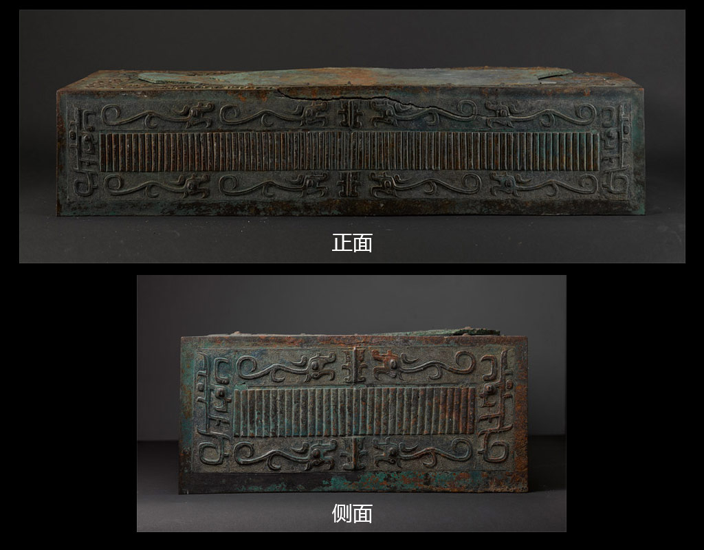 高20.5厘米 长94.5厘米 宽45厘米 石鼓山西周墓地3号墓出土 出土于3号壁龛。器身为长方体,中空。禁面四周装饰一圈双首龙纹;四侧面边沿部素面,正中装饰直棱纹,上下以突起的扉棱为中心各装饰相对的四组龙纹,昂首,阔嘴,吻部外翻,圆目,体躯修长,卷尾,左右各饰一组直立的俯首鸟纹,鸟首,曲喙,弯角,圆目,变体上下伸长,卷尾;短边上下各为两组龙纹,左右亦为一组鸟纹。纹饰均以雷纹为地。禁内壁的顶面与侧面之间皆有用以稳固的加强筋,四个侧面底边内敛,亦起加强筋作用。