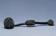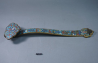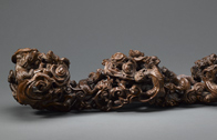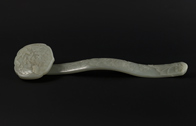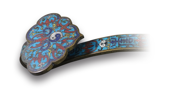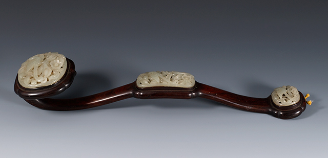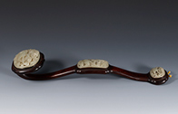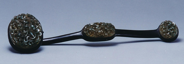 如意结构一般由首部和柄部组成。早期如意首部多呈手型,魏晋时代佛教持物则常见心型或云叶型首,宋代又出现了首部如灵芝状的如意,成为后世主流式样。明清如意造型多样,常见的有首柄式、两头式和三镶式。清代宫廷尤为钟爱三镶如意,其形制庞大、堆料贵重,有首尾柄三个如意头,是极为名贵的陈设器。用于镶嵌的如意头往往采用复杂的图案设计与繁重的雕镂,图案多寓意吉祥富贵,雕饰更极尽华丽精巧之能事,充满奢靡之风。