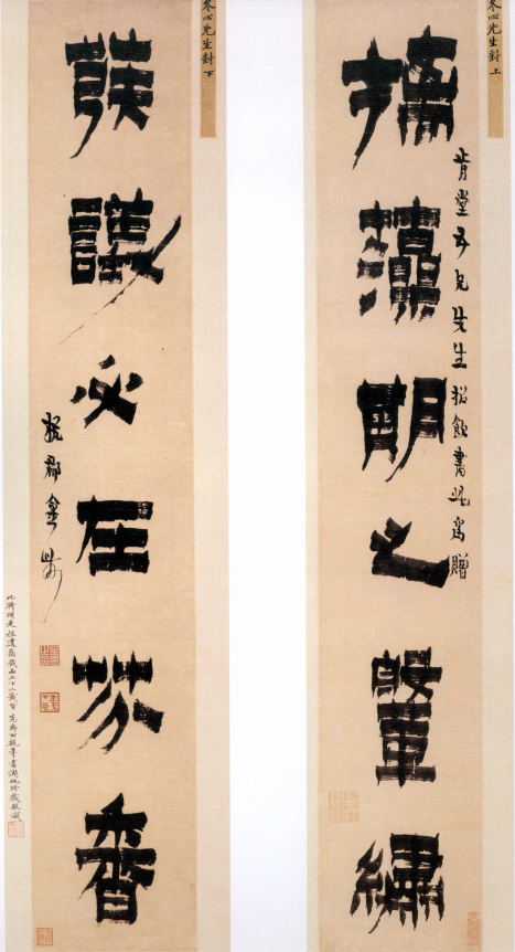 纸本 金农(1687-1763),字寿门,号冬心等,仁和(今浙江杭州)人。扬州画派画家之一。联语出自《北齐书.鸿勋》。金农后期的八分书,破圆为方,墨浓如漆,后人称之为“漆书”。 从吴湖帆的裱边题跋可知,此联为其祖吴大澂藏品。跋文字里行间,流露出对祖传藏品的珍惜之情。