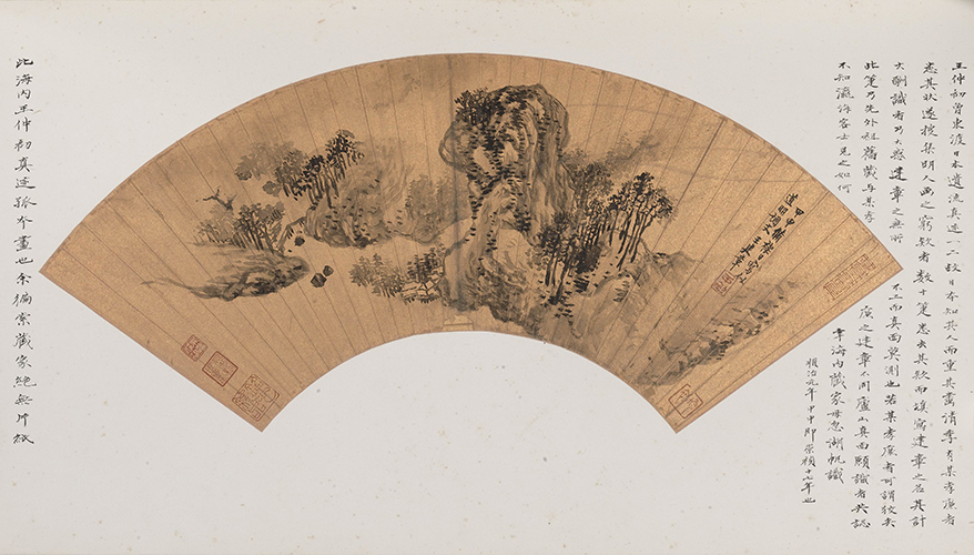 崇祯十七年(1644) 金笺 水墨 王建章(十七世纪),字仲初。 此扇系吴湖帆外祖沈树镛旧藏。经吴湖帆考证指出:王建章真迹不多,画亦无甚出色,因曾东渡日本,作品流传至日本而被彼人奉为至宝。现存王建章款图扇面貌风格不一,不知者以为建章风格多变,实则“某孝廉”为牟利搜集明人画扇数十箑,去其款而填写建章之名的伪作。而这件王建章款图扇才是王氏作品的真正面貌。