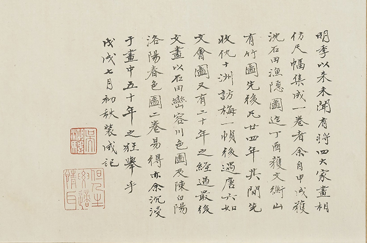 明季以来,未闻有将四大家画相仿尺幅集成一卷者。余自甲戌(1934)获沈石田《渔隐图》,迄丁酉(1957)获文衡山《有竹图》,先后凡廿四年。其间先收仇十洲《访梅》一帧,后遇唐六如《文会图》,又有二十年之经过。最后文画以石田《峦容川色图》及陈白阳《洛阳春色图》二卷易得,亦余沉浸于画中五十年之狂举乎!戊戌(1958)七月初秋装成记。