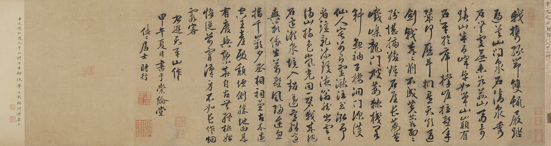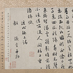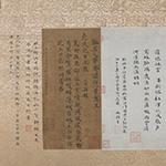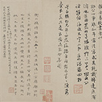 明人诗牍册 吴湖帆喜爱以一个主题将藏品集册或集卷,尤其喜爱汇集苏州乡贤的作品,移入移出拼配的现象也时有发生。比如本集册中申时行《游天平山诗》页,原与王鏊《自作六十寿诞词》合装一卷,后为吴湖帆拆分,将王鏊《自作六十寿诞词》移配《明四家集锦卷》,与唐寅为王鏊所绘《文会图》呼应,而申氏此诗页则与册中其它吴门文人如文徵明、唐寅、祝允明等诗牍合册。
