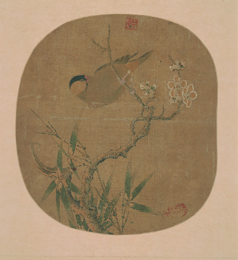 绢本 设色 林椿(十二世纪),钱塘(今浙江杭州)人,淳熙间(1174-1189)中画院待诏。工花鸟、草虫、果品,以赵昌为师;设色清淡,精工逼真。本图画红梅翠竹,残雪未消;寒禽梳羽,神态生动,为林氏花鸟画杰作。 此为吴湖帆、潘静淑夫妇移居沪上后入藏,与其购藏的南宋佚名《鹌鹑图》页大抵同时,据此不难发现其这一时期收藏趣味之所在。