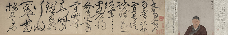 隆庆元年(1567) 纸本 徐渭(1521-1593),字文清、文长,号天池、青藤等,山阴(今浙江绍兴)人。此书作于隆庆元年,作者时年四十七岁。 二十世纪上半叶,藏友间互通有无性质的馈赠颇为流行,体现了当时的文人雅玩风尚,梅景书屋亦不例外。此卷为徐渭草书,卷前清人《徐渭肖像》系吴氏弟子王季迁所赠,吴湖帆将两者装为一卷。徐渭擅草书,狂放不羁而不逾法度,吴湖帆欣赏此种特色,于此卷非常珍重,多次题跋,对其风格、源流、流传考证详尽。
