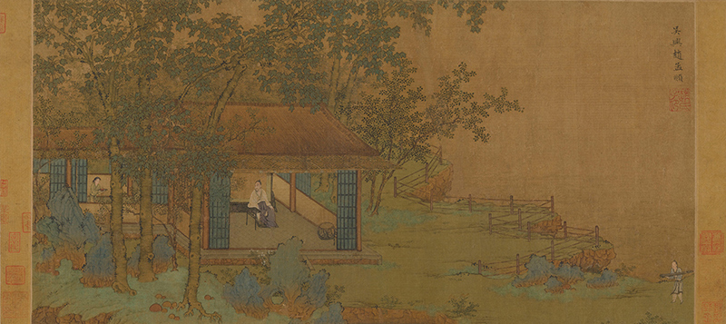 图卷首题署“吴兴赵孟頫”和 “赵氏子昂 ”朱文方印皆系后添。图绘文人园居闲适之景。庭院梧桐枝叶茂盛,古趣盎然。据谢稚柳考察,此图是比赵孟頫《秋郊饮马图》更为早期的作品。傅熹年撰写《元人绘〈百尺梧桐轩图〉研究》,指出此图所绘是张士信园居的情景。 曾经明人吴廷(用卿)、清人梁清标和近人周怀民收藏。吴湖帆于1952年应收藏家周氏之邀为其题跋。
