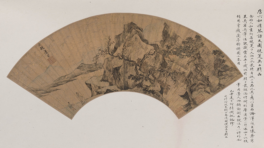 金笺 设色 吴湖帆的鉴定注重作品的笔法、印记和款识的审定。从跋文可知,吴湖帆据“笔法款识”,初步判断此图是唐寅“当在五十岁以前精力最弥漫时所作”,再据唐氏自钤“学圃堂” 一印作为断代年份之旁证,称“此印亦四十以后所用”。可见,印鉴在书画鉴定与研究中所起到的辅助作用,吴氏皆予以相当重视。