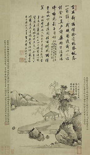 1944年吴湖帆获藏此图之际,根据家藏另一件沈周正德二年(1507)《牡丹花》轴(南京博物院)推断,图中上款“复端”即为澄江缪复端。更为重要的是,吴湖帆将《苔石图》轴中沈周八十岁书风作为参照物,进而对沈周题唐寅的无年份作品《款鹤图》卷进行了真伪鉴定与年份考证。
