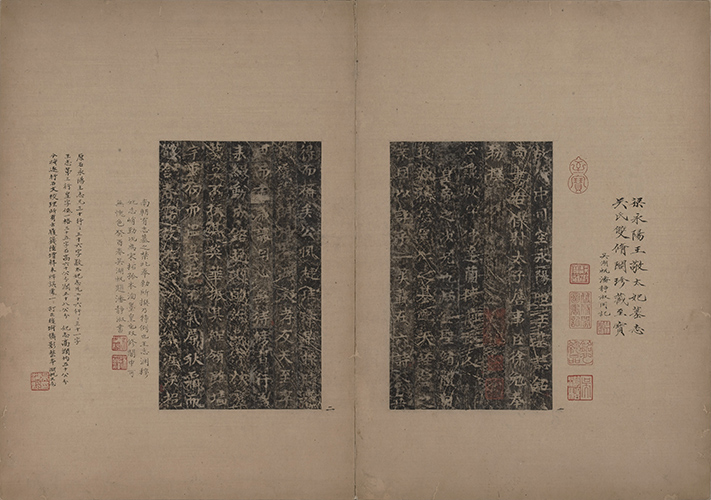 吴湖帆题跋释文:“南朝有志墓之禁,此奉敕所撰,乃特例也。王志淵穆,妃志峭勁,況為宋拓孤本,洵墨皇也。雙修閣中,可無愧色。癸酉(1933)春,吳湖帆題,潘靜淑書。” “原石《永陽王志》,凡三十行,行三十六字;《敬太妃志》,凡二十六行,行三十一字。王志第三行‘皇’字低一格,三十五字;石高六十公分,闊五十八公分。妃志高闊均五十公分。今將逐行石文校理,所有方履籛、陸增祥未辨、誤處,一一訂正;后附攝影整本,湖帆又志。”