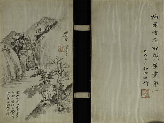 对自己喜欢的藏品,吴湖帆往往反复题跋,除了一些鉴定或考证的文字外,亦多有诗词或书画之作。如此册的板面背绢上即以董氏风格戏作小景一帧,笔墨气韵与原作极为相近,吴自称此等行为“恐自古未有”,得意之情跃然纸上。